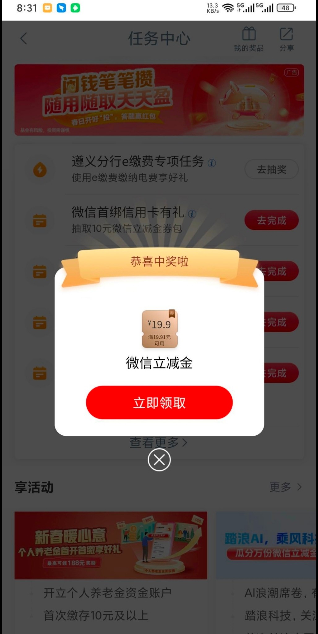 工行飞贵州遵义,任务中心缴费任务中19.99,户号0603138507236171,付0.01必中19.99