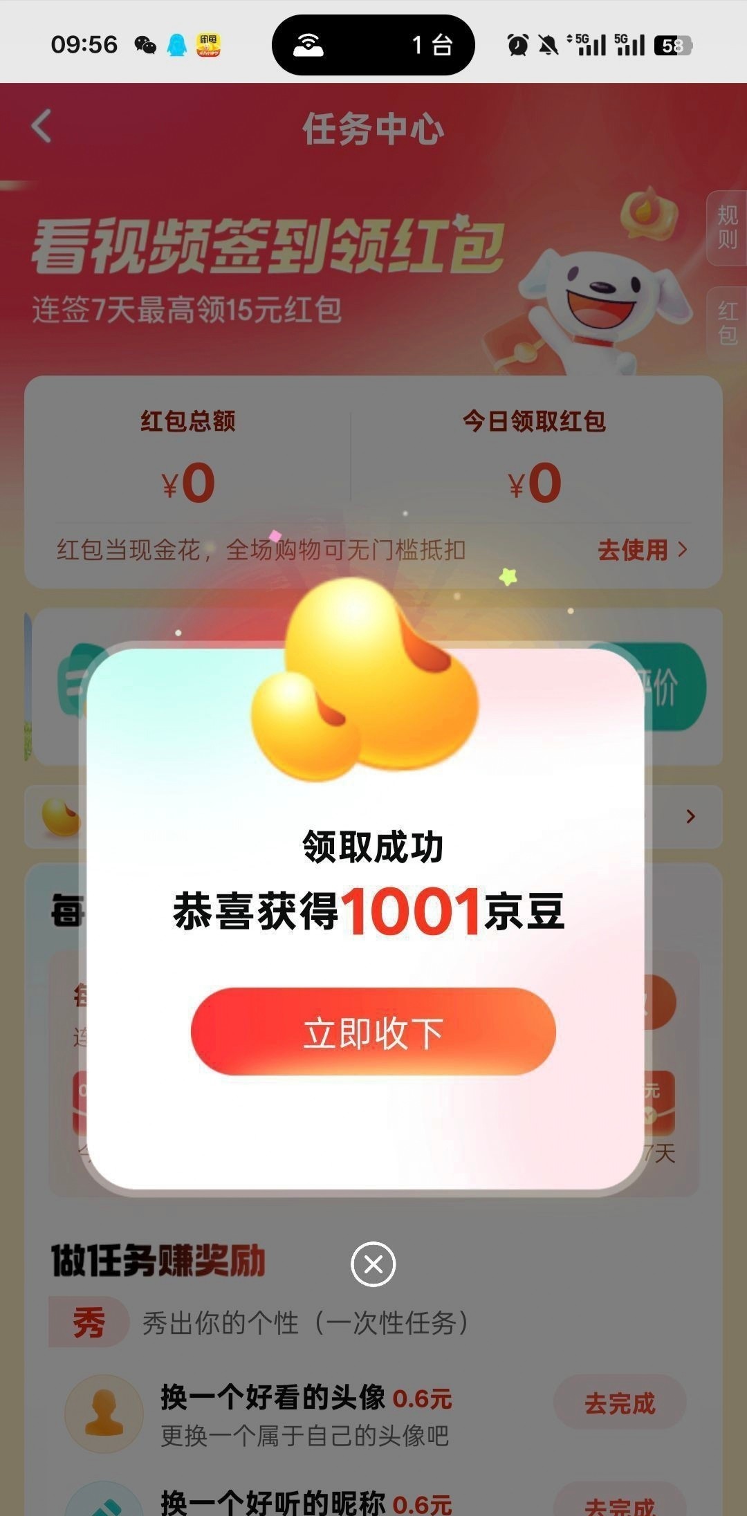 现在刷新了,昨天一个今天就是1001京豆了