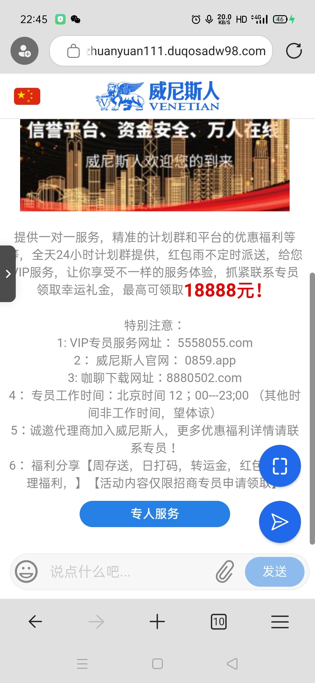 链接进去点专属客服 进去一定要先发手机号再发“接到电话获取网址领取彩金”