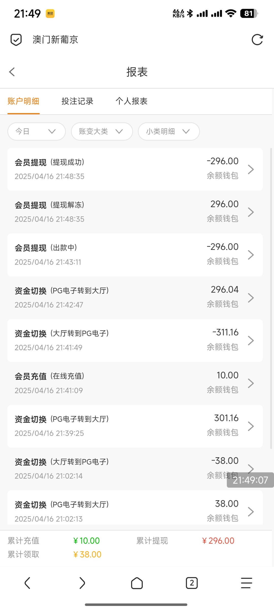 告诉你们 只要是免费彩金特邀不要打太多,基本上会出。100~200之间。黄播控制在100左右 这样大大提升了出款几率。
