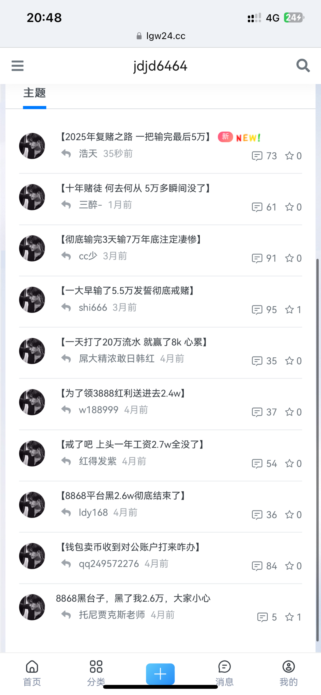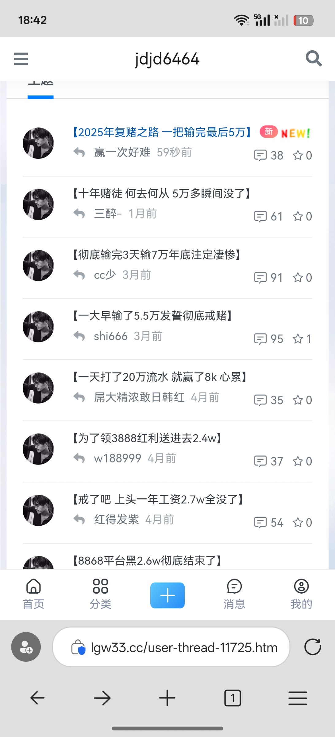 才毕业没几年,17年开始玩到现在总共输20w左右,天天偷家里钱玩,现在没工作天天就翻短信接电话白嫖,已经彻底绝望了