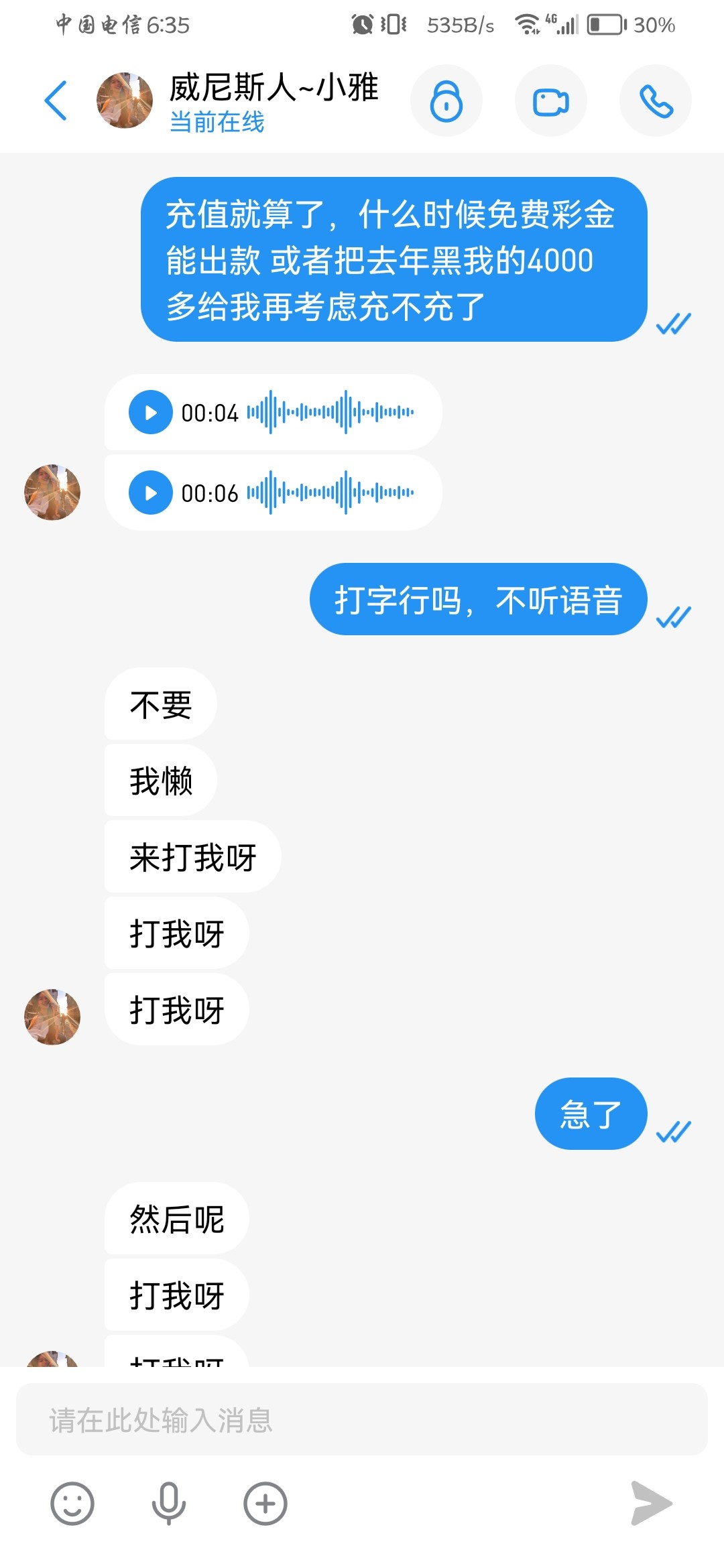 去年黑我4000多,今天给我打电话送了118逼水没有,我说不充值他就急了,这个傻逼给你们打电话回访你们别充值这就是个黑台子,千万别充值让他没业绩主管草死他 他TB名字叫小雅记住了老哥们