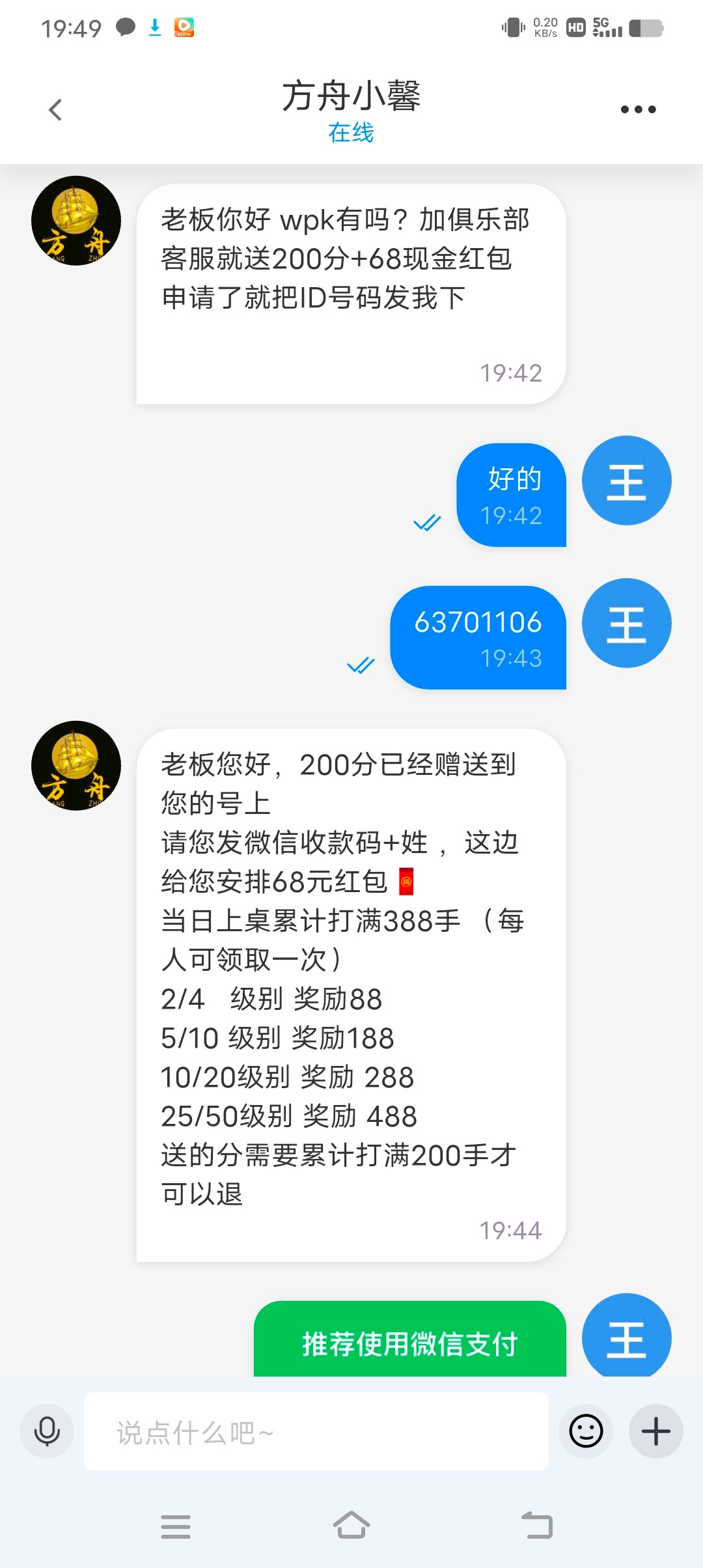 下午收到短信,方舟俱乐部,200+68,结果狗日的要看战绩,都不玩德州哪来的战绩,结果不送!!!之前收到另一个俱乐部短信都没问战绩,直接送68红包和200分。。