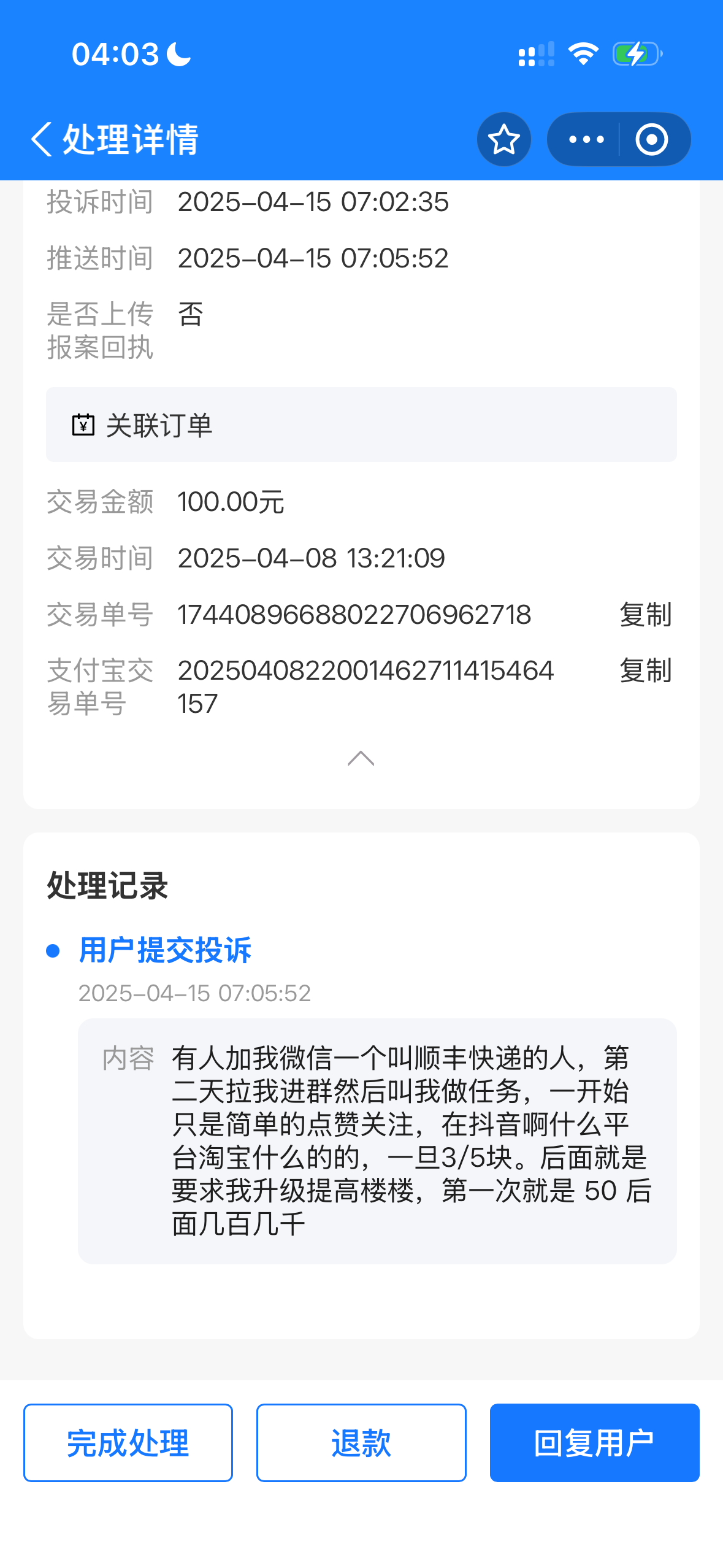 支付宝投诉没用,这个冒充钱包客服的我截图了聊天记录和转账记录还是被驳回了!