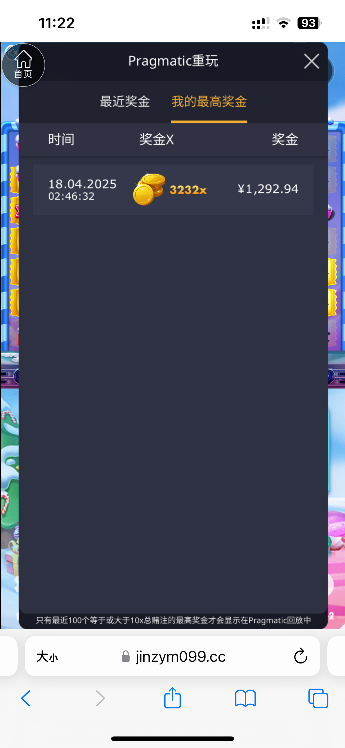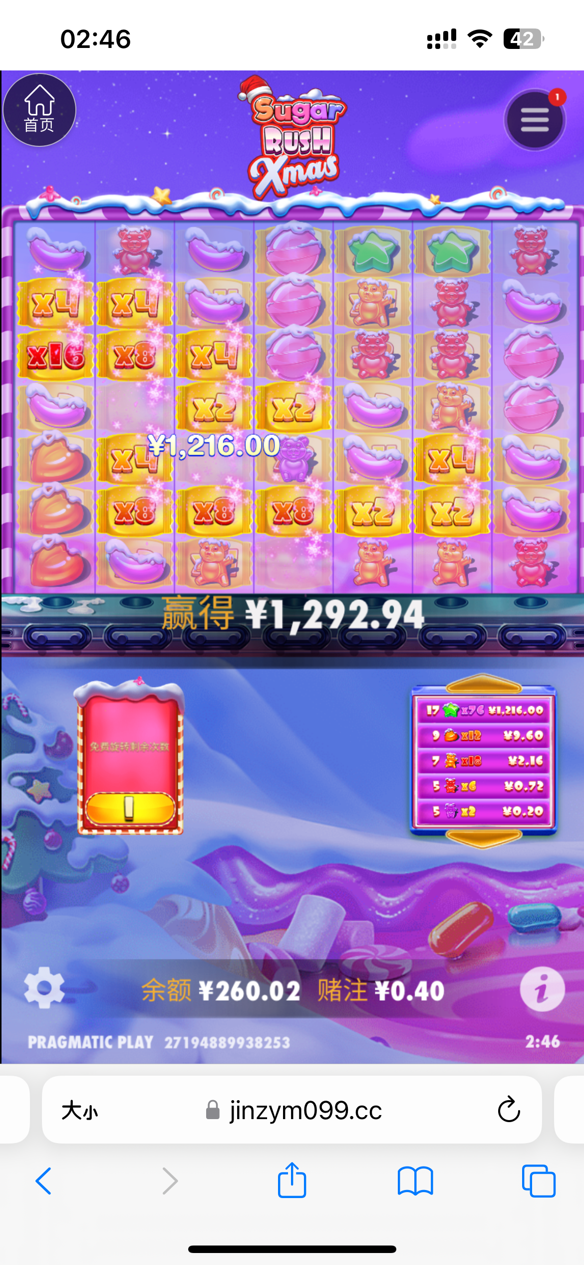 昨天在新出的台子充值300 输了上300 跑野鸡去上了300 最后上了600到晚玩的台子本来人输麻木了 想输就输吧 把钱都输光 结果没有买过pp去买了一手0.4糖果第一手3千倍 当时就笑了 唯有赌博有来回啊老哥们!