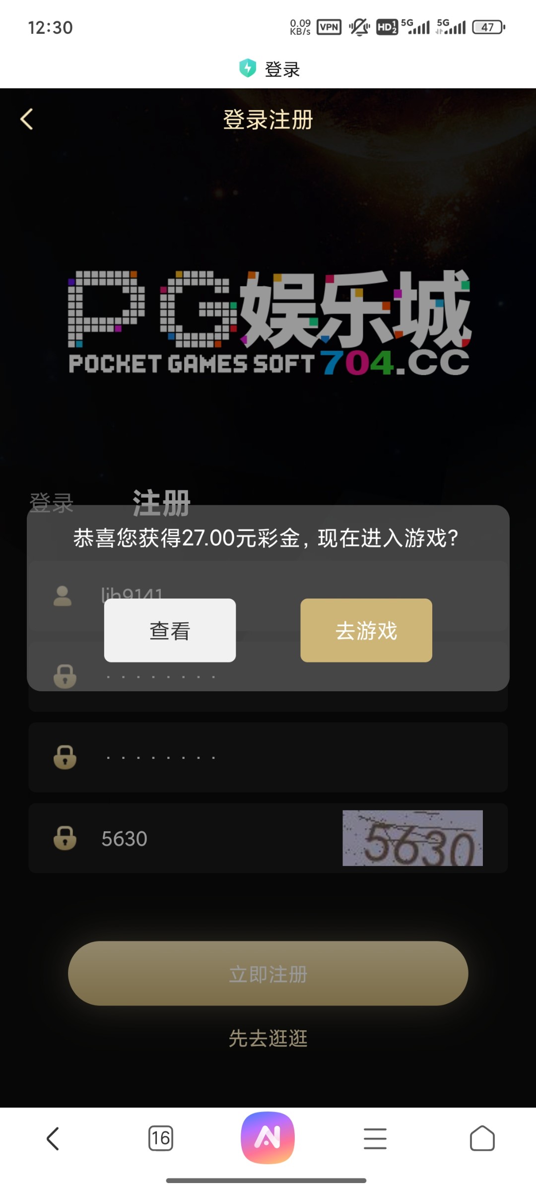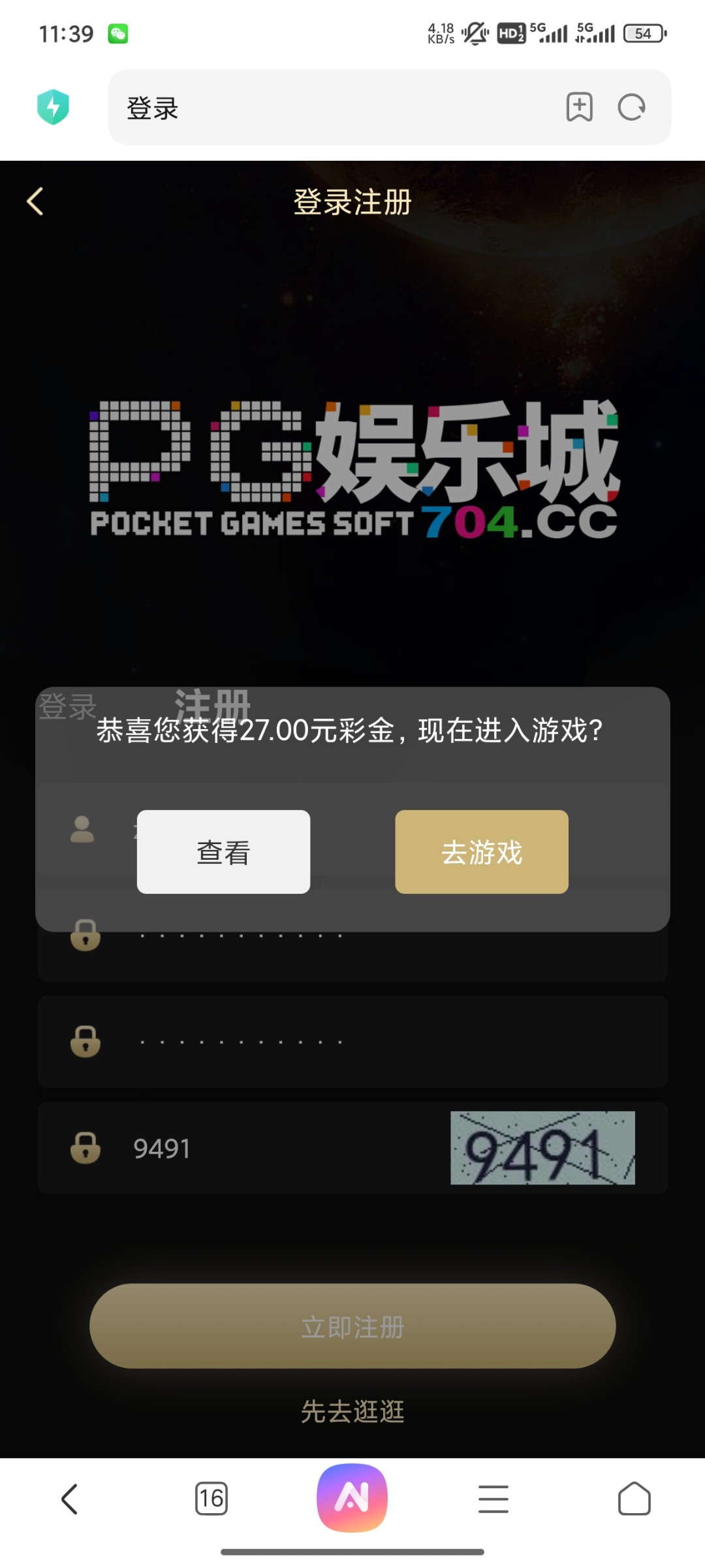 注册送27,不用申请,直接点完成注册就秒到了,切换vpn还可以注册,还是送,我不推广,好东西和大家分享,27只能玩pg电子,我是玩棋牌的,电子搞不定啊,三个号一个都没打出来,最下面的新葡京不送,大家不用试了
