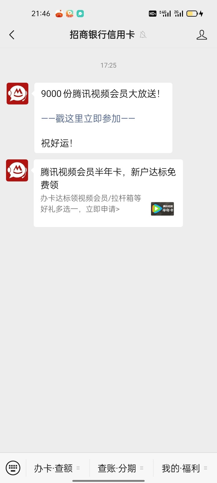 招商银行信用卡公众号白嫖两个月腾讯会员,非必中