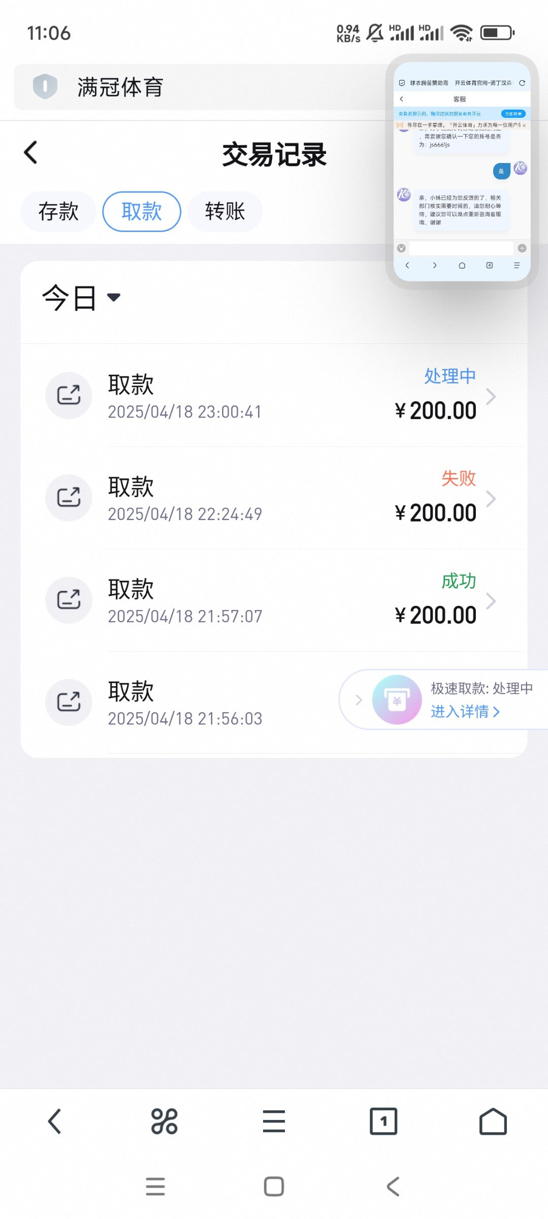 累了累了 一晚上就p上了2个博系 结果p上来都没来得及出款就被发现了 我都是3分钟之内就刷完流水的 这个满贯体育 我用的极速转卡p的 成功了。秒锁定 找客服 客服帮我解开了 后来打到400 又被锁定了。说要扣除200 扣了200之后盈利的那200还在 我现在提款 不知道能不能到账 被退回了一次 没说原因