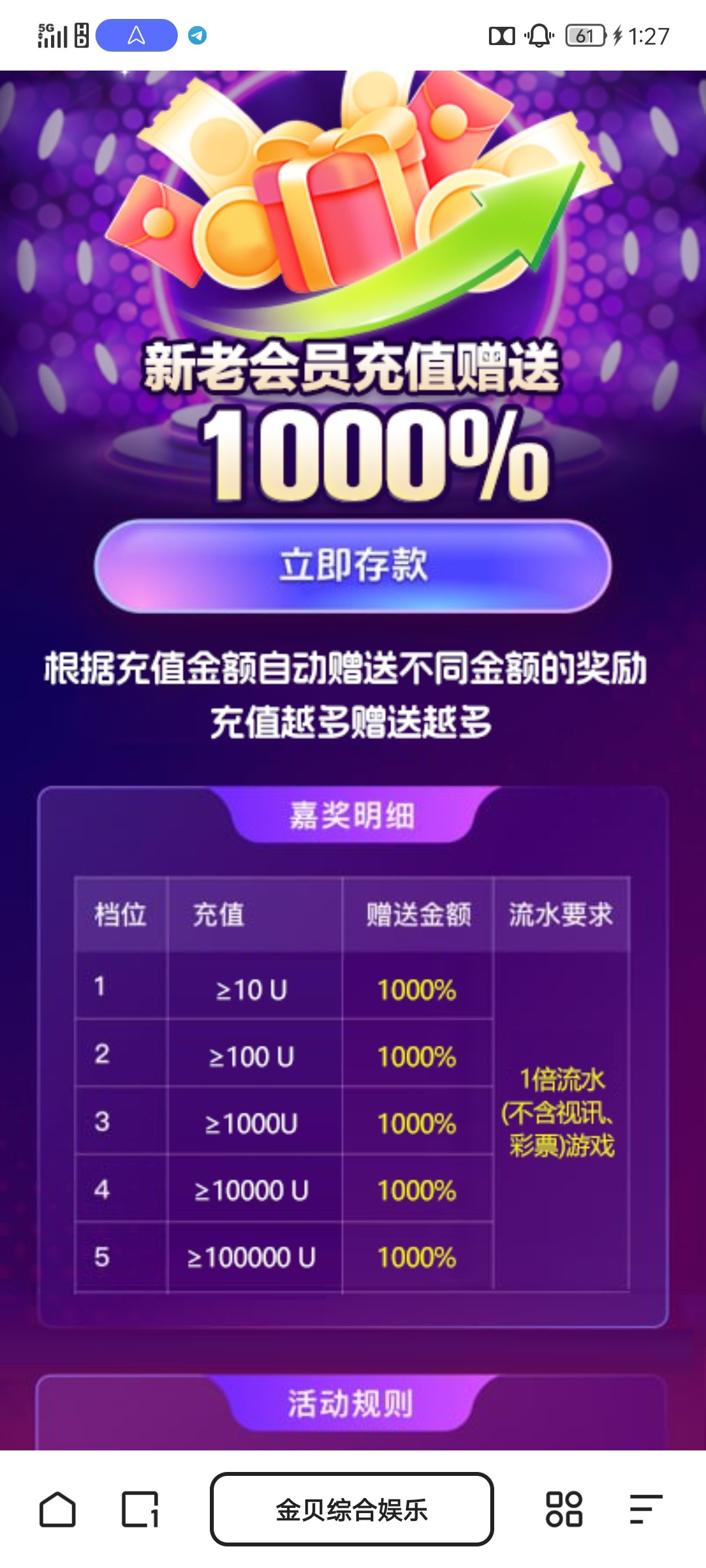别被几把金贝娱乐骗了,活动一点都不说清楚,我充了11u上去,告诉我要打流水,10u打300的流水才能获得10u彩金,流水越多彩金越多,被最后打pg一点水不给,11u 0.2一拉,免费每次都差一个进,拉了可能六七十次就没了