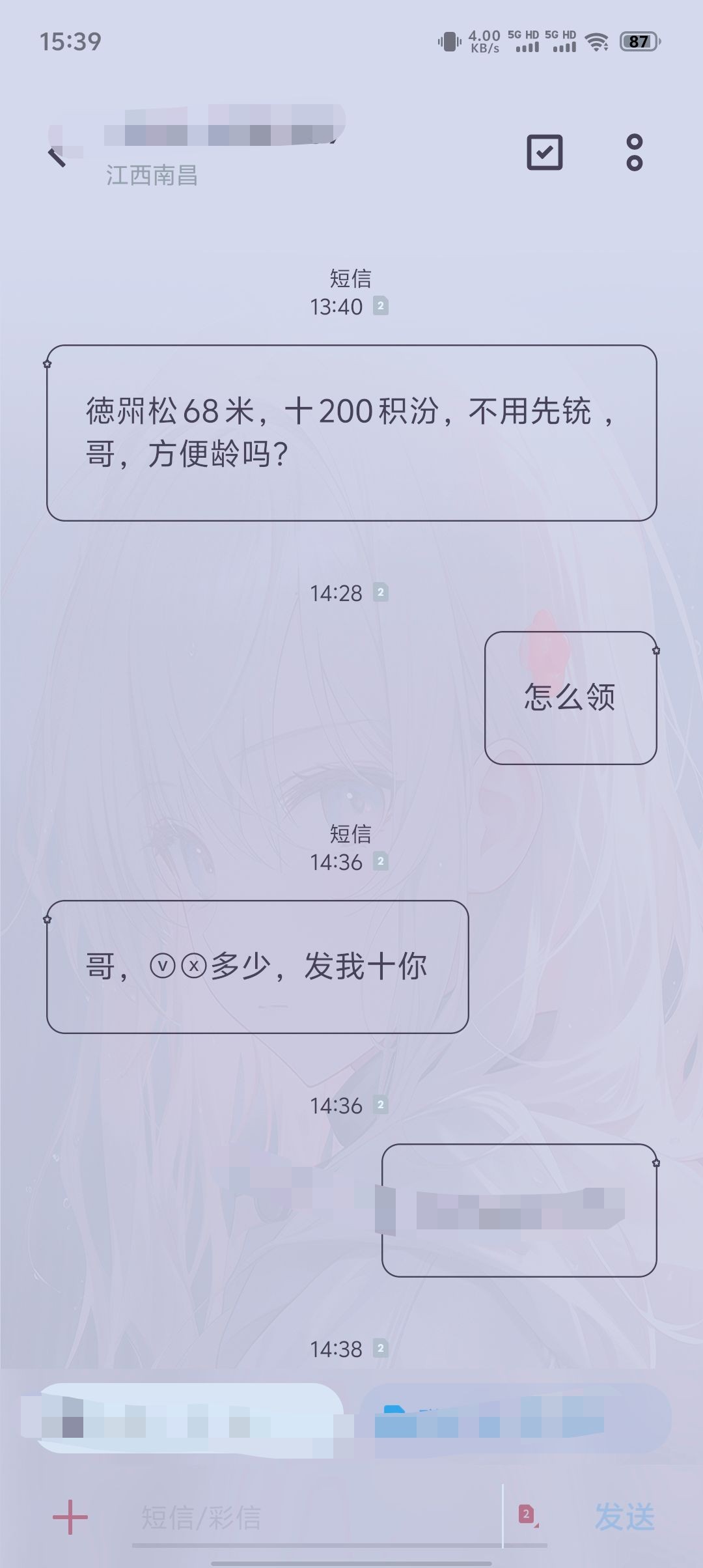 坤坤46 ▶ PIpi 上次我收到短信了回复他了一直不理人我直接打电话过去了他就直接加我微信了68加200分 9月前