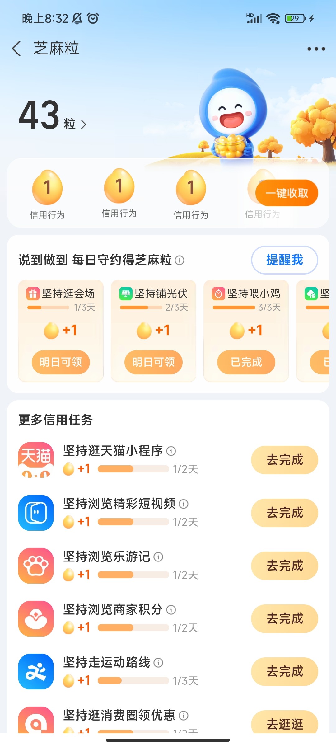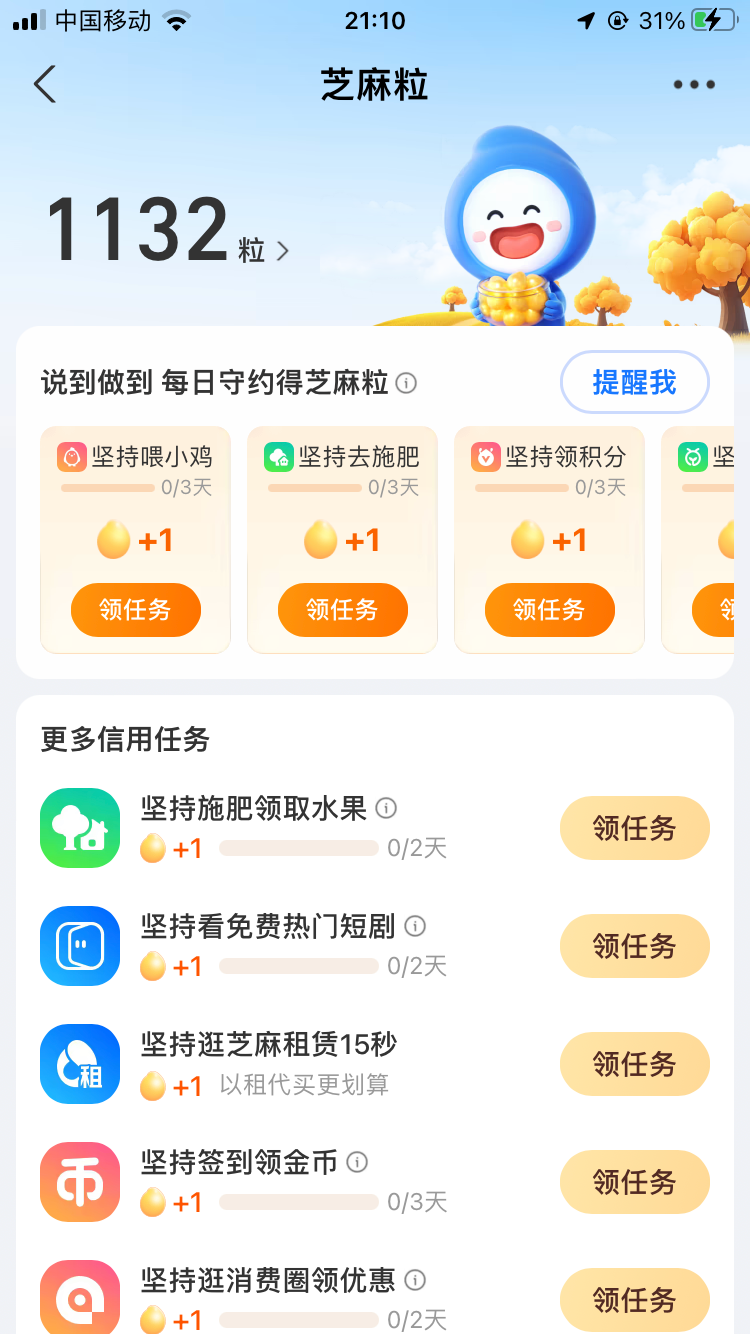 以前支付宝逾期未修复,缺芝麻粒,支付分低,还在到处找朋友助力修复,每个月还在花几十块钱买芝麻粒修复逾期的老哥,给你们的钱节约下来多吃两顿猪脚饭,支付宝点芝麻信用,进去点芝麻粒,里面有任务,每天花三五分钟分钟做一下这个任务,两三天能搞十多二十粒左右,每天都有,一个月修复一次慢慢把分养起来吧