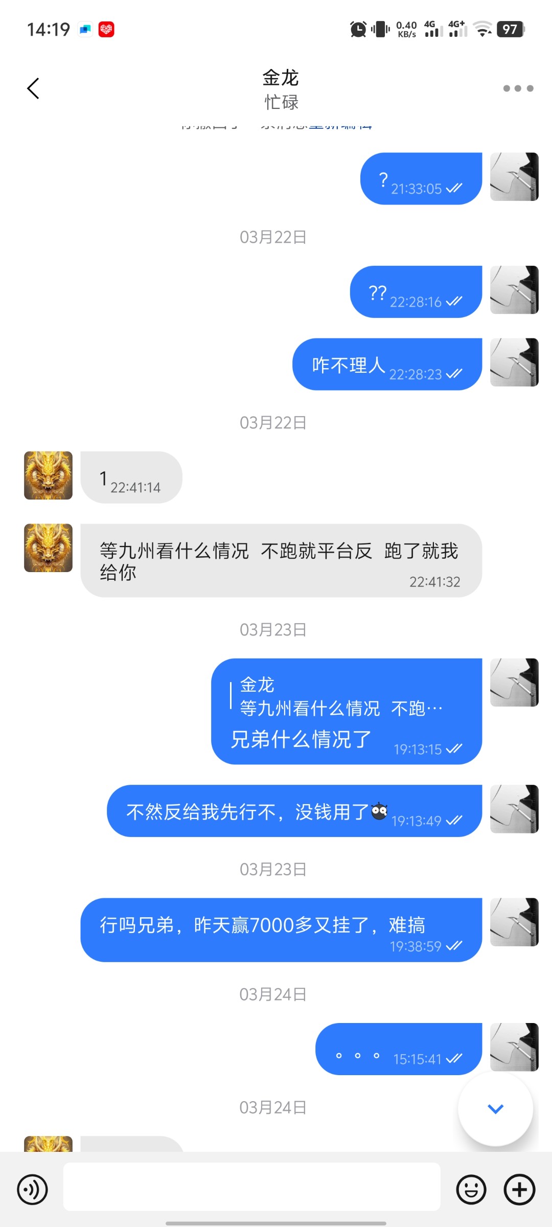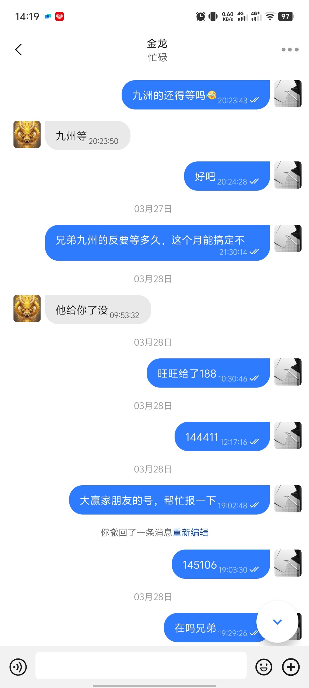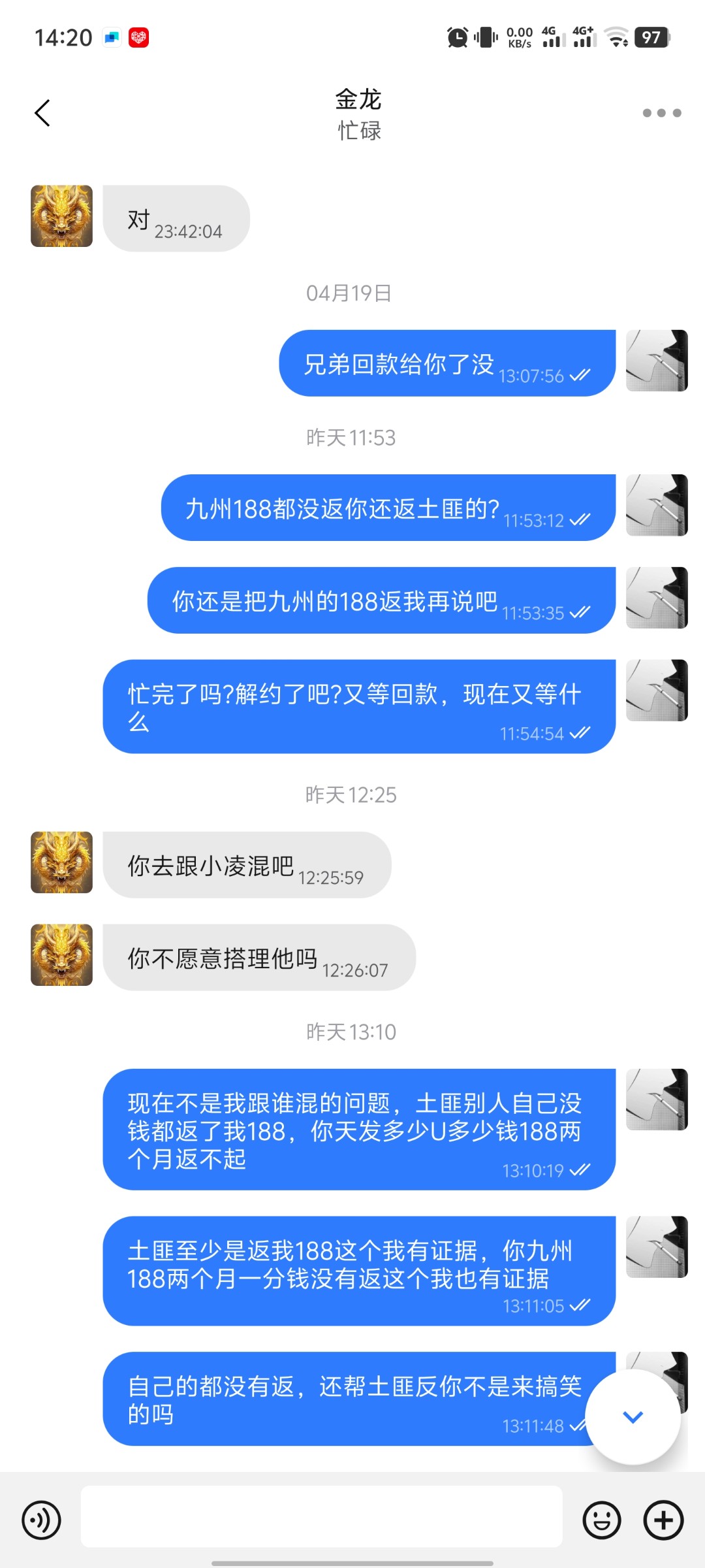 金龙给你18块钱你就去黑人家了,为了18块钱什么都干得出来是吧,金龙九州188等两个月毛没有,天天发多少U出来装,土匪旺旺28的马上先返我188了,金龙实力九州188两个月,又是忙又是生孩子,又等解约又等回款,后面跟土匪搞这个了,他在群里面说要帮土匪返,我说不要他返土匪的,我叫他先返九州188不敢说话了,实力是有的,18块钱就能请人黑别人,看图吧精彩