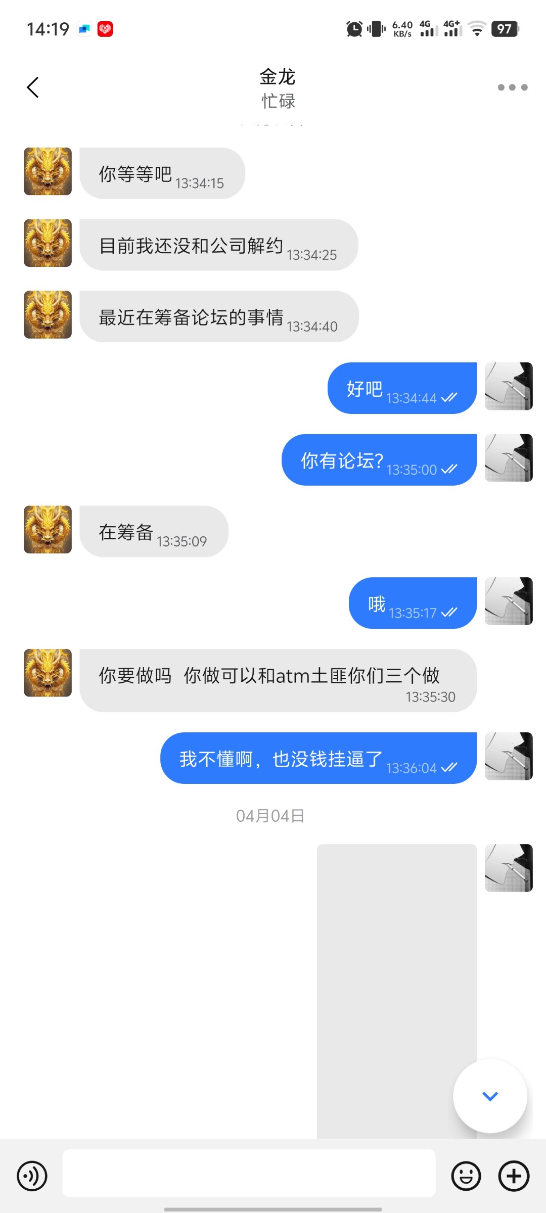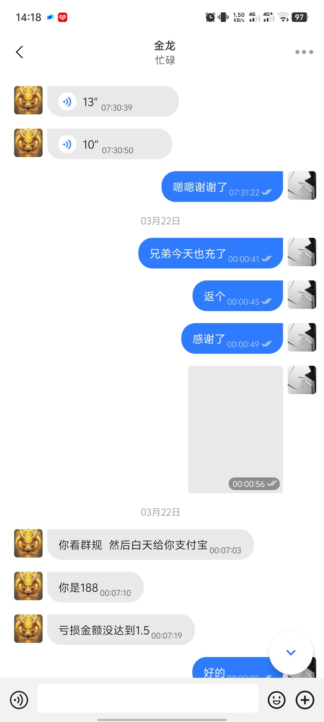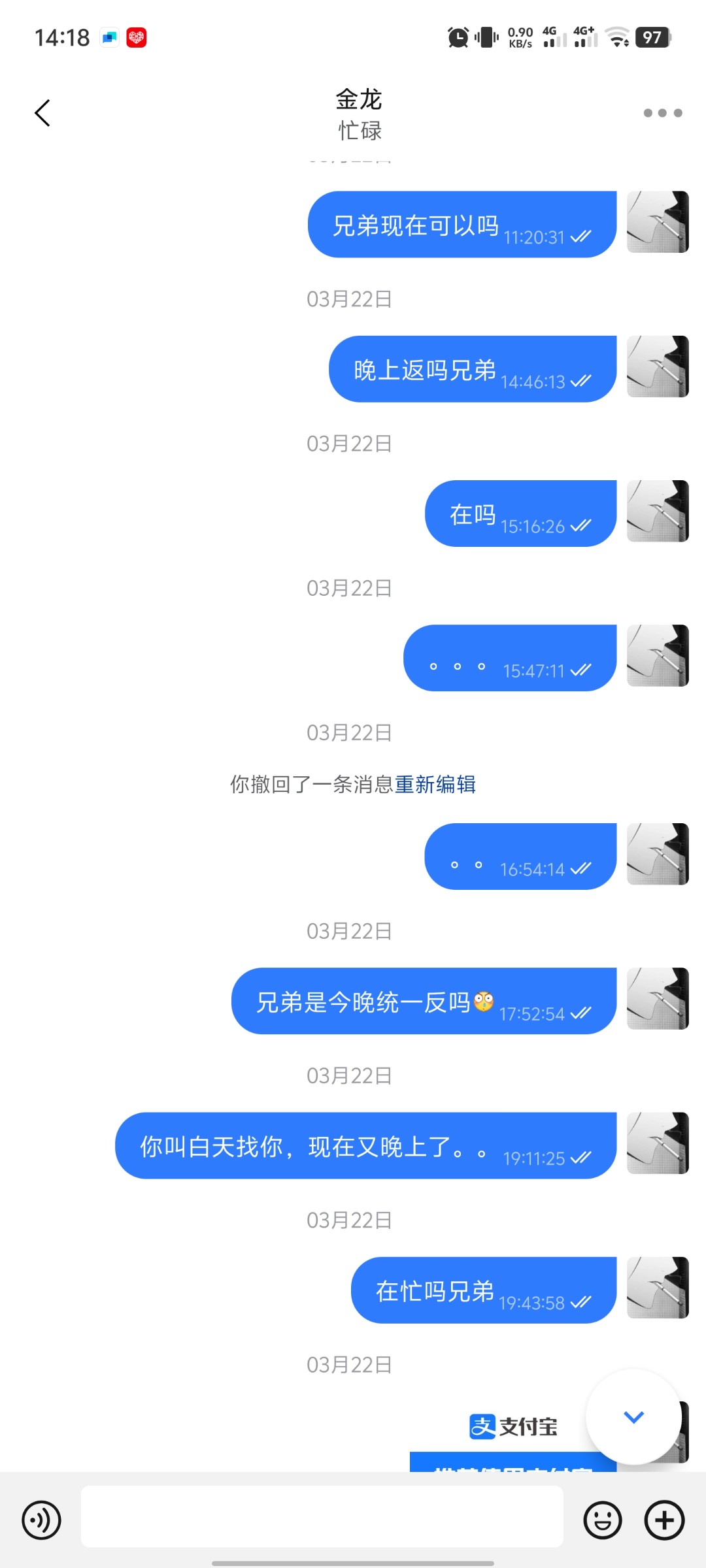 金龙给你18块钱你就去黑人家了,为了18块钱什么都干得出来是吧,金龙九州188等两个月毛没有,天天发多少U出来装,土匪旺旺28的马上先返我188了,金龙实力九州188两个月,又是忙又是生孩子,又等解约又等回款,后面跟土匪搞这个了,他在群里面说要帮土匪返,我说不要他返土匪的,我叫他先返九州188不敢说话了,实力是有的,18块钱就能请人黑别人,看图吧精彩