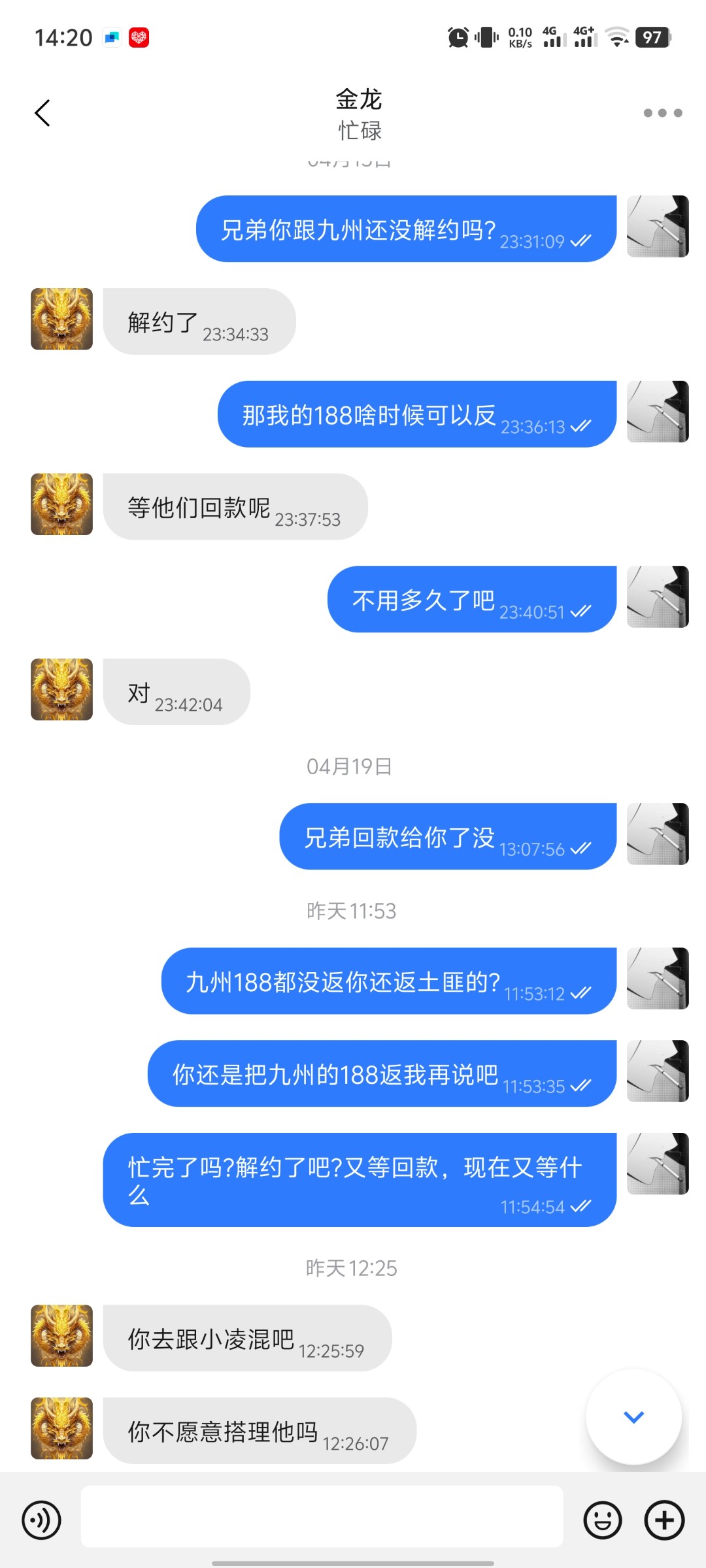 快让金龙把九州的188返了 还有那个和你一起黑我那个下级 388你也给他返一下