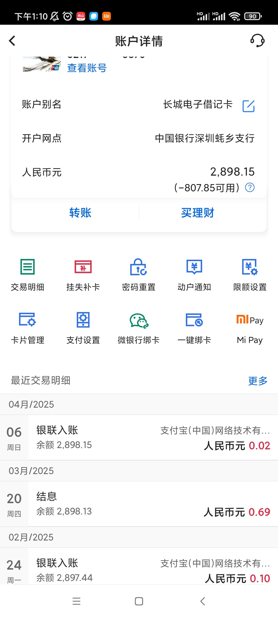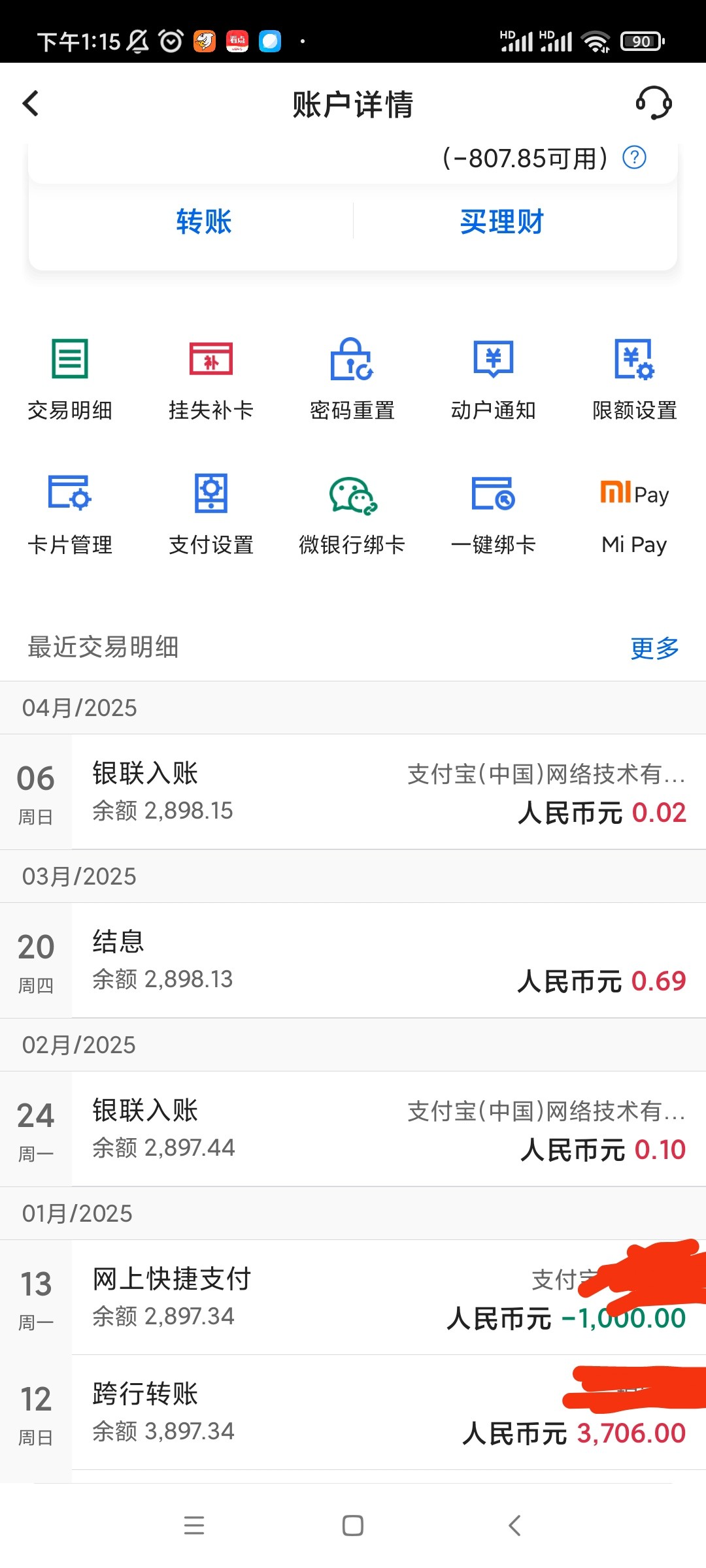 1月份提的中国银行3.7k,第二天冲到支付宝1k,然后银行就拒绝交易了,现在有余额,点进去是负数,卡片状态正常,万能的老哥碰到过这样的情况吗 悉心求教,希望不要中出我。