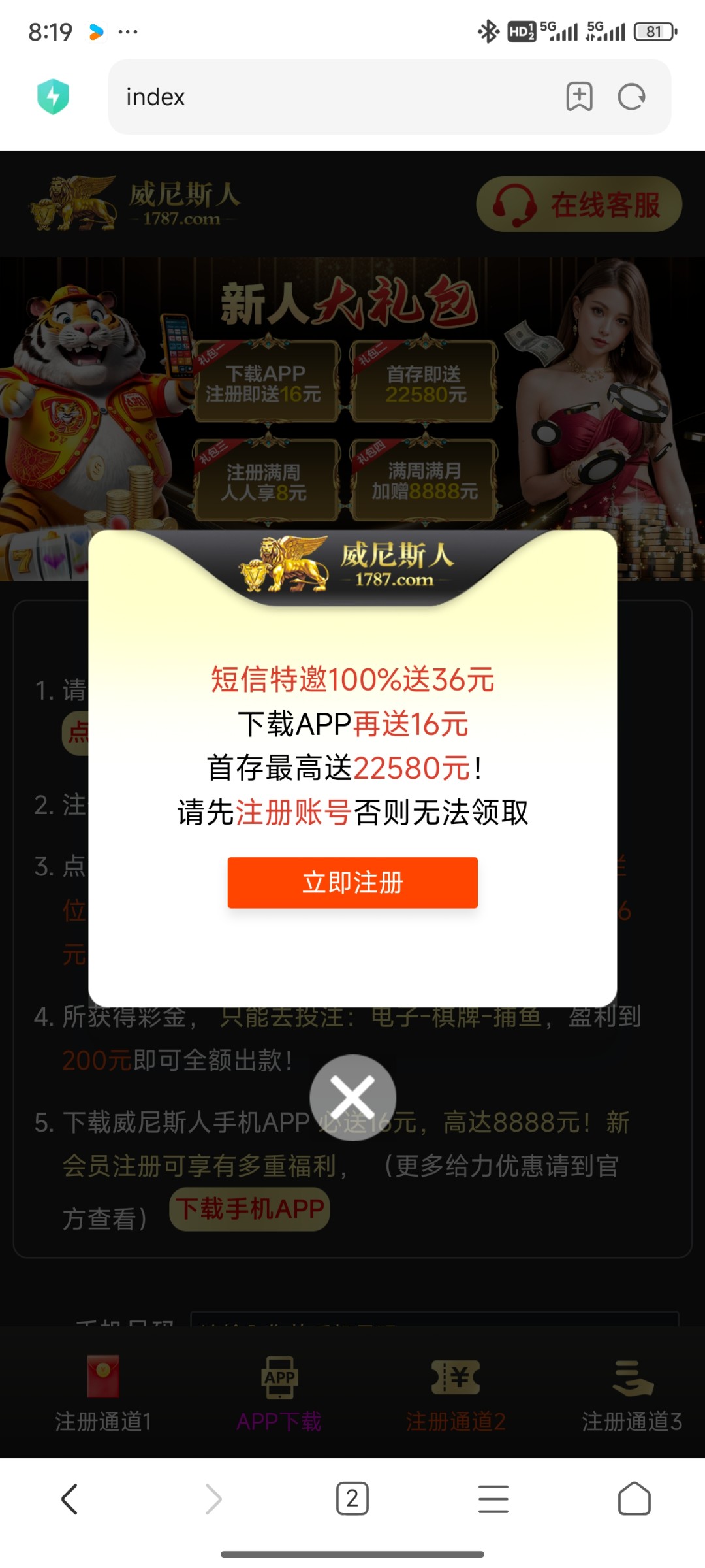 打开网站020.vip然后点击立即注册,不用绑卡注册完账号重新打开020.vip输入手机号账号去碰瓷送36,下载APP送16直接提现,也可以玩以大博小,存16送28彩金,200提现,只能电子,提款老哥给个猪脚饭,速去