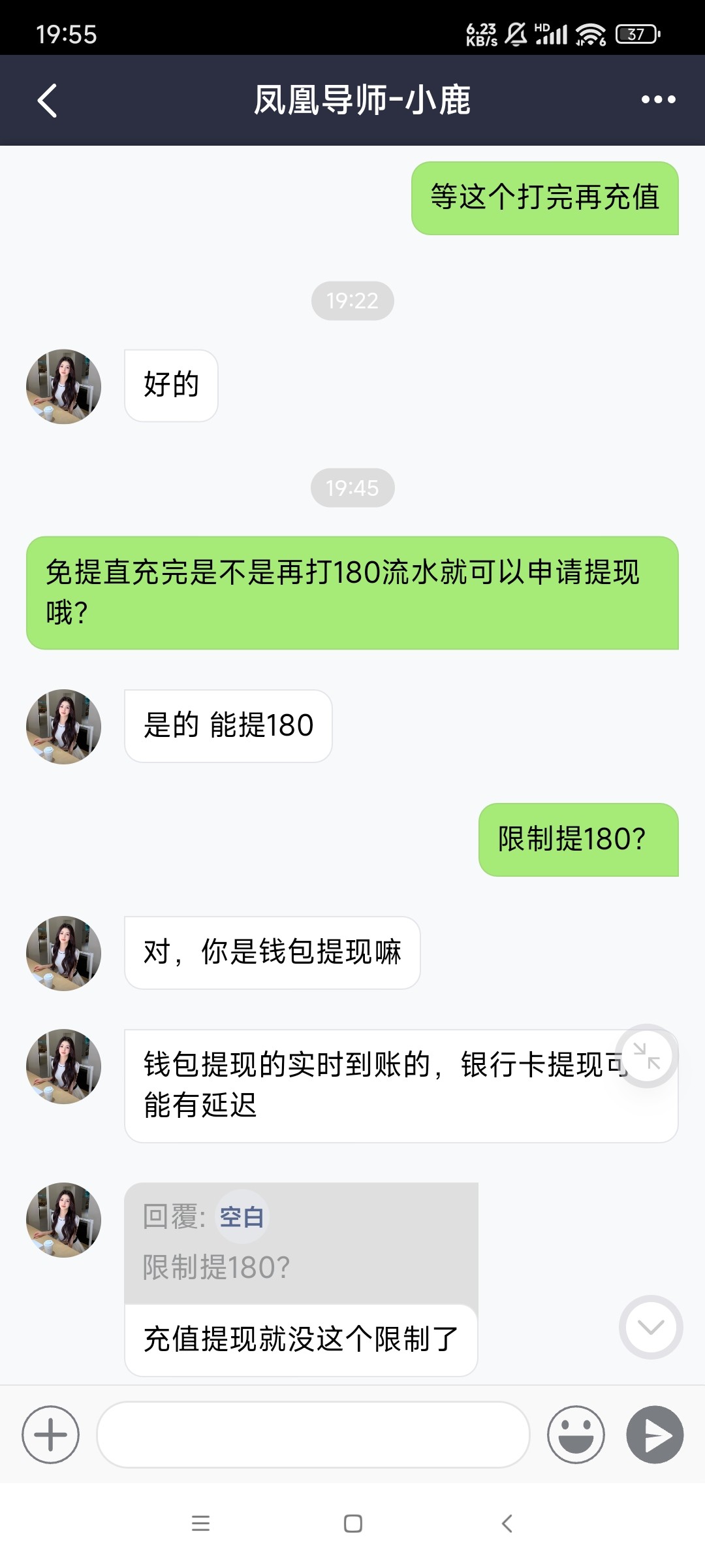 你打到180就能提??那个叼毛导师跟我说要打十倍水还要余额180然后免提直充再打180水才能提。。然后我打到300又跟我说只能提180。。早知道只能提180我就藏分了。。