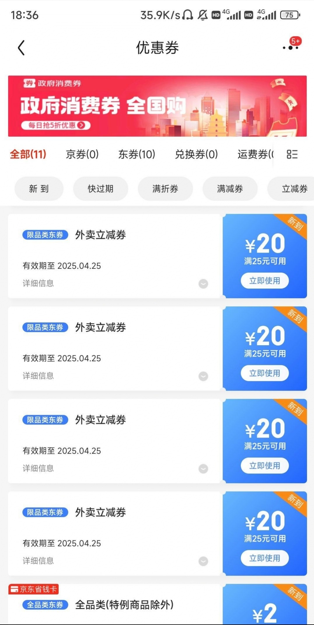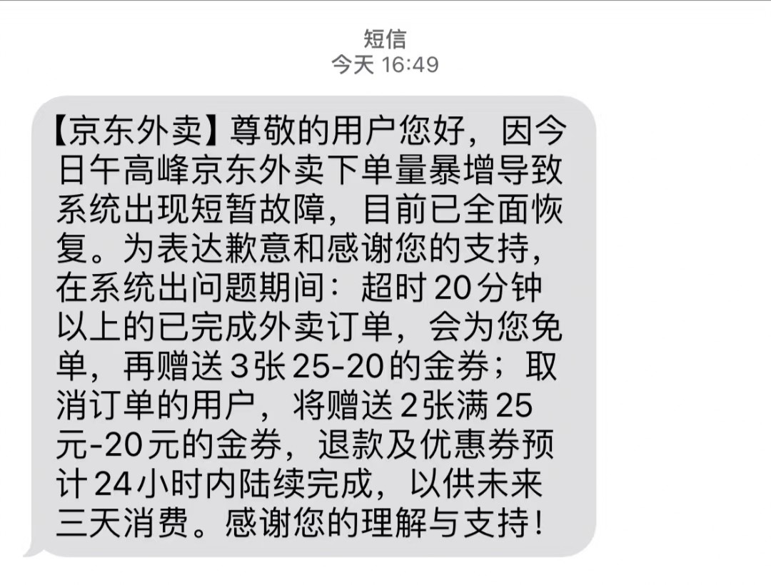 今天下午京东外卖崩了,下午用过京东外卖的直接去找客服领取25-20的优惠券,领取5张