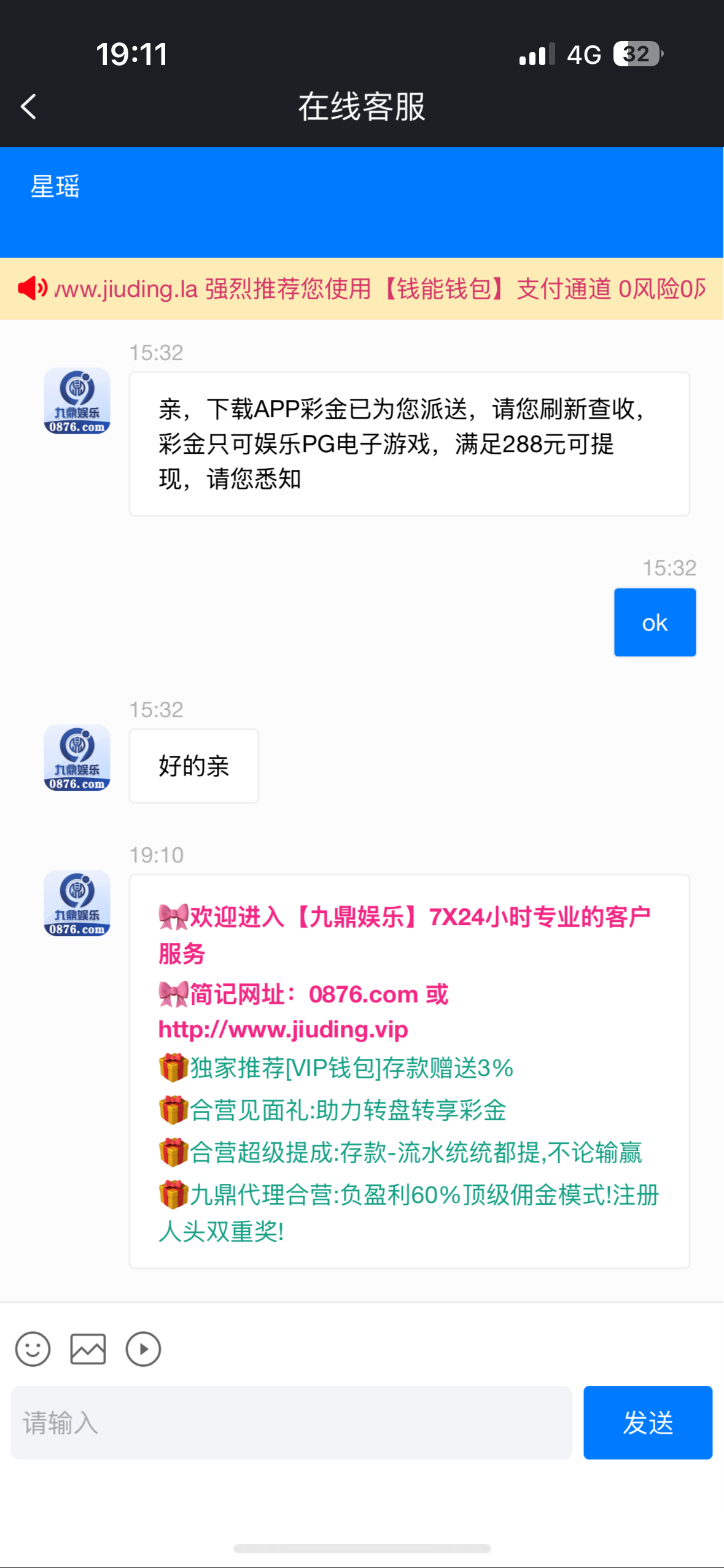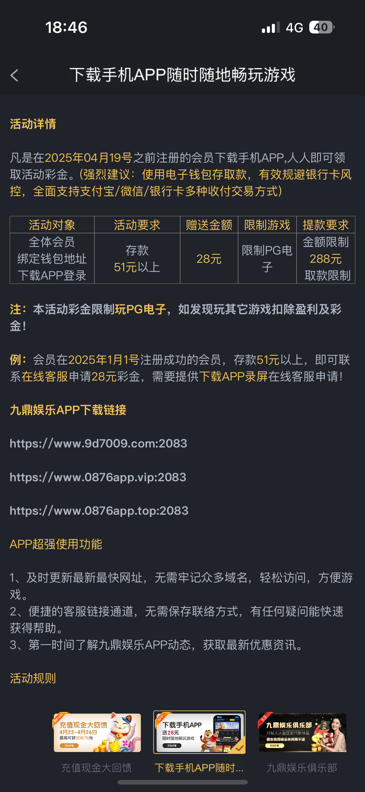 在4月19号之前注册并充值过51以上找客服领28元彩金288可提款 详情看图片 我没打出来 自测 请勿充值 链接:0876.com