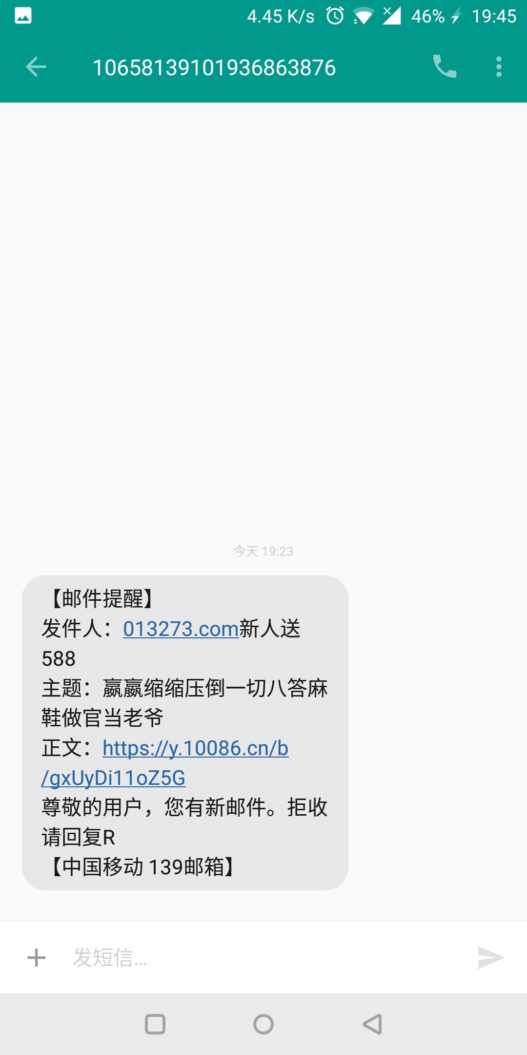 【邮件提醒】发件人:013273.com新人送588主题:嬴嬴缩缩压倒一切八答麻鞋做官当老爷正文:https://y.10086.cn/b/gxUyDi11oZ5G尊敬的用户,您有新邮件。拒收请回复R【中国移动 139邮箱】