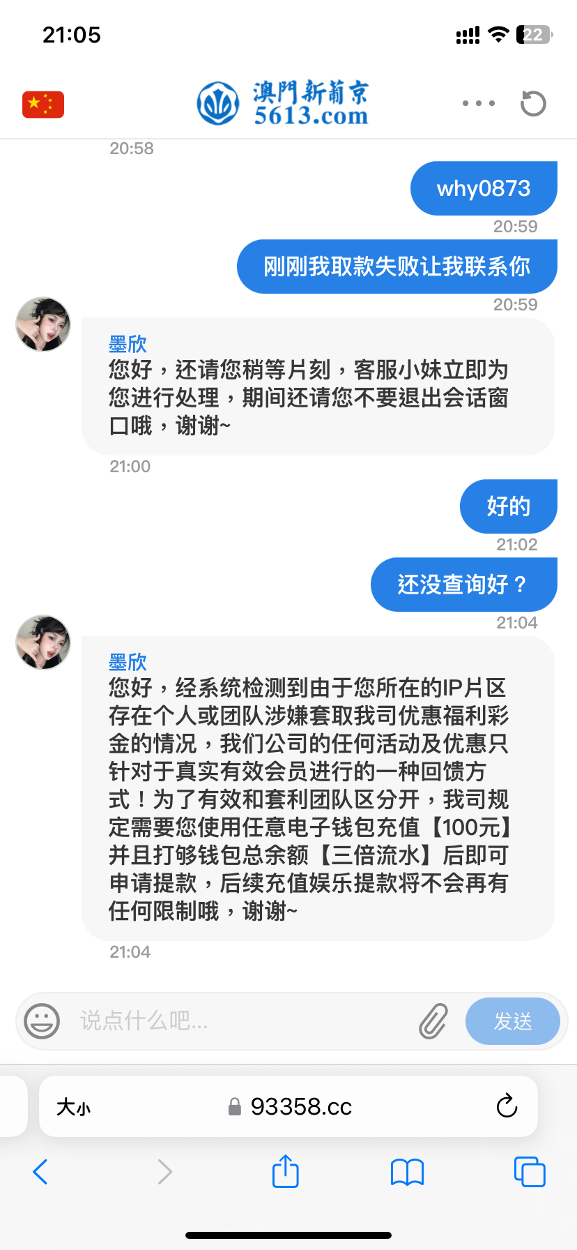 您好,经系统检测到由于您所在的IP片区存在个人或团队涉嫌套取我司优惠福利彩金的情况,我们公司的任何活动及优惠只针对于真实有效会员进行的一种回馈方式!为了有效和套利团队区分开,我司规定需要您使用任意电子钱包充值【100元】并且打够钱包总余额【三倍流水】后即可申请提款,后续充值娱乐提款将不会再有任何限制哦,谢谢~