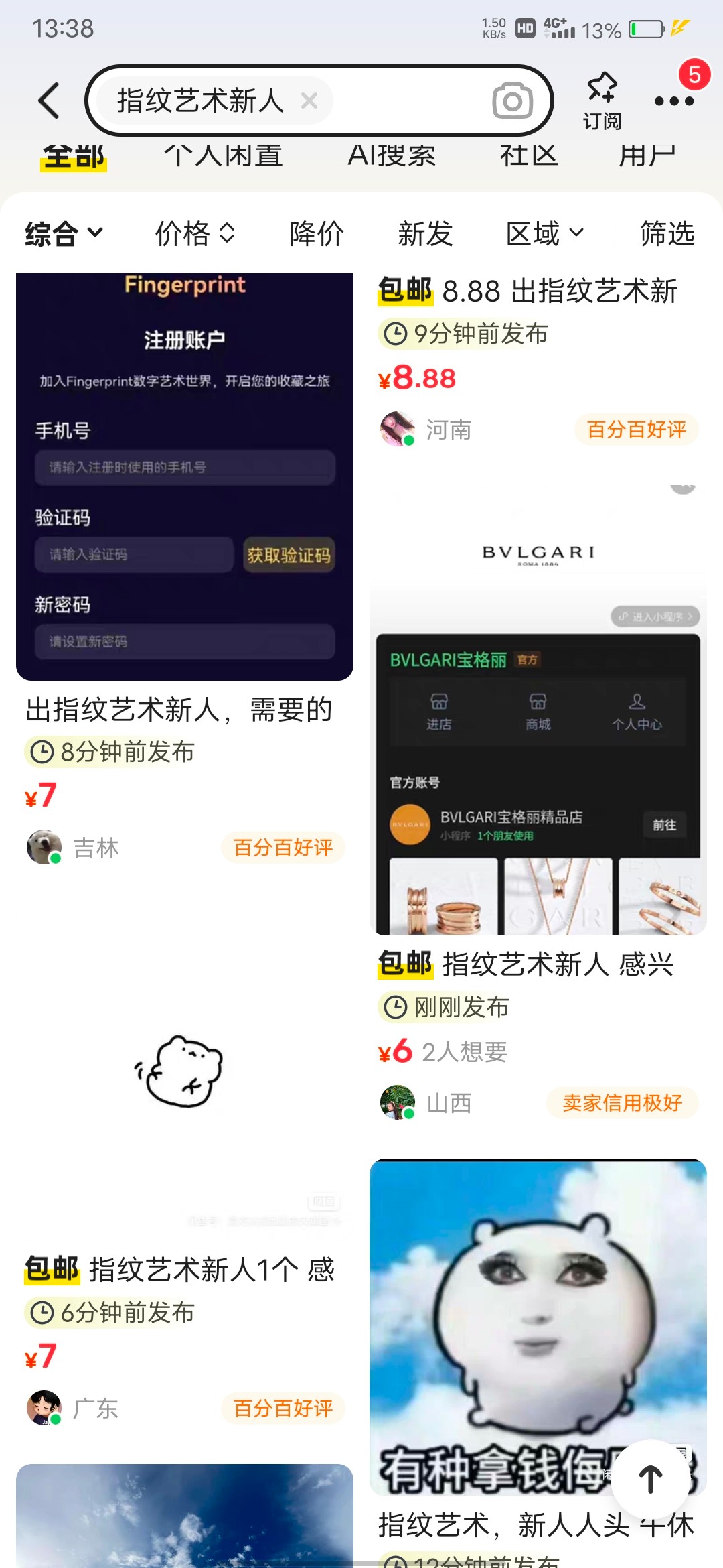 咸鱼搜指纹艺术,挂在主页上基本就是秒卖,