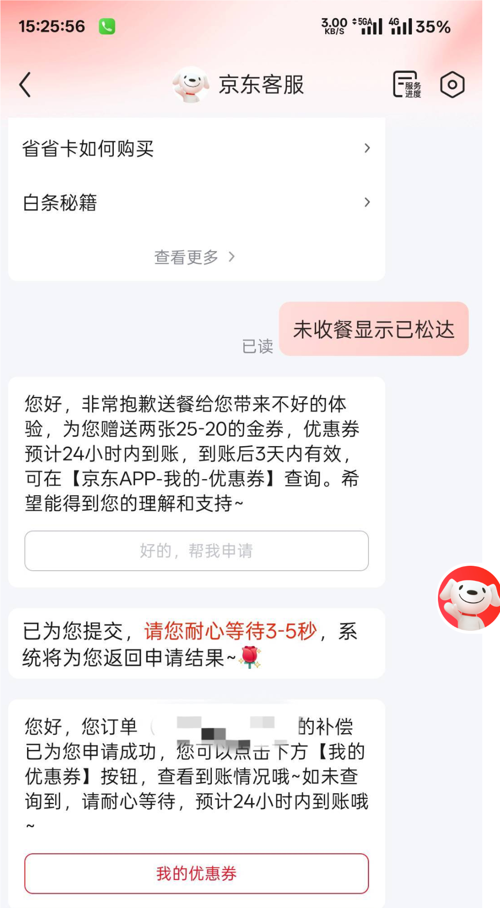 这两天用过京东秒送的去找客服,理由,外卖超时送达/未送达,不好吃等理由。会送25-20的券。申请不到的老哥不要中出我