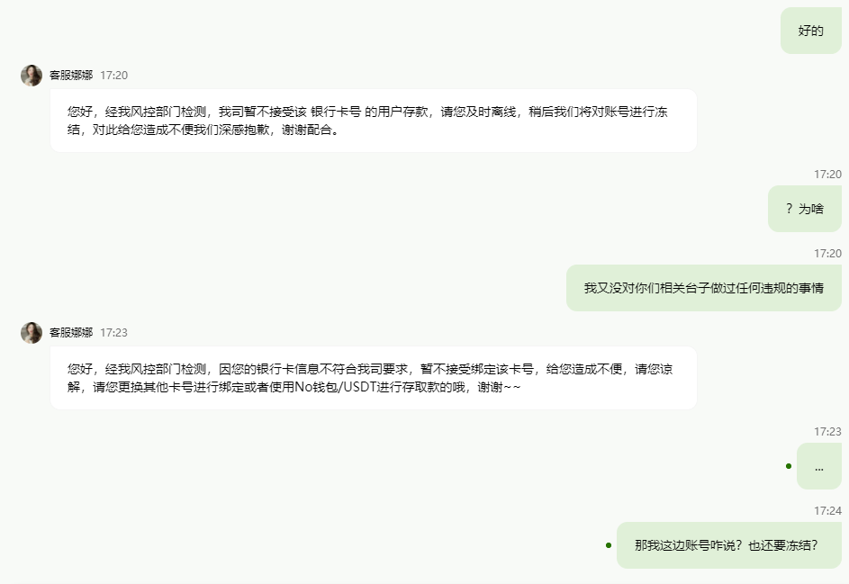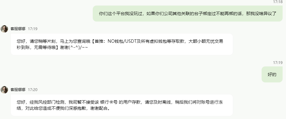 先绑了钱包,然后我觉得不妥就想再绑个卡号,发现绑不了。还以为是未提款前只能绑一个提款信息。于是我就去问客服为啥绑不了卡号后面就这对白,吓得我都不敢参与以小博大了