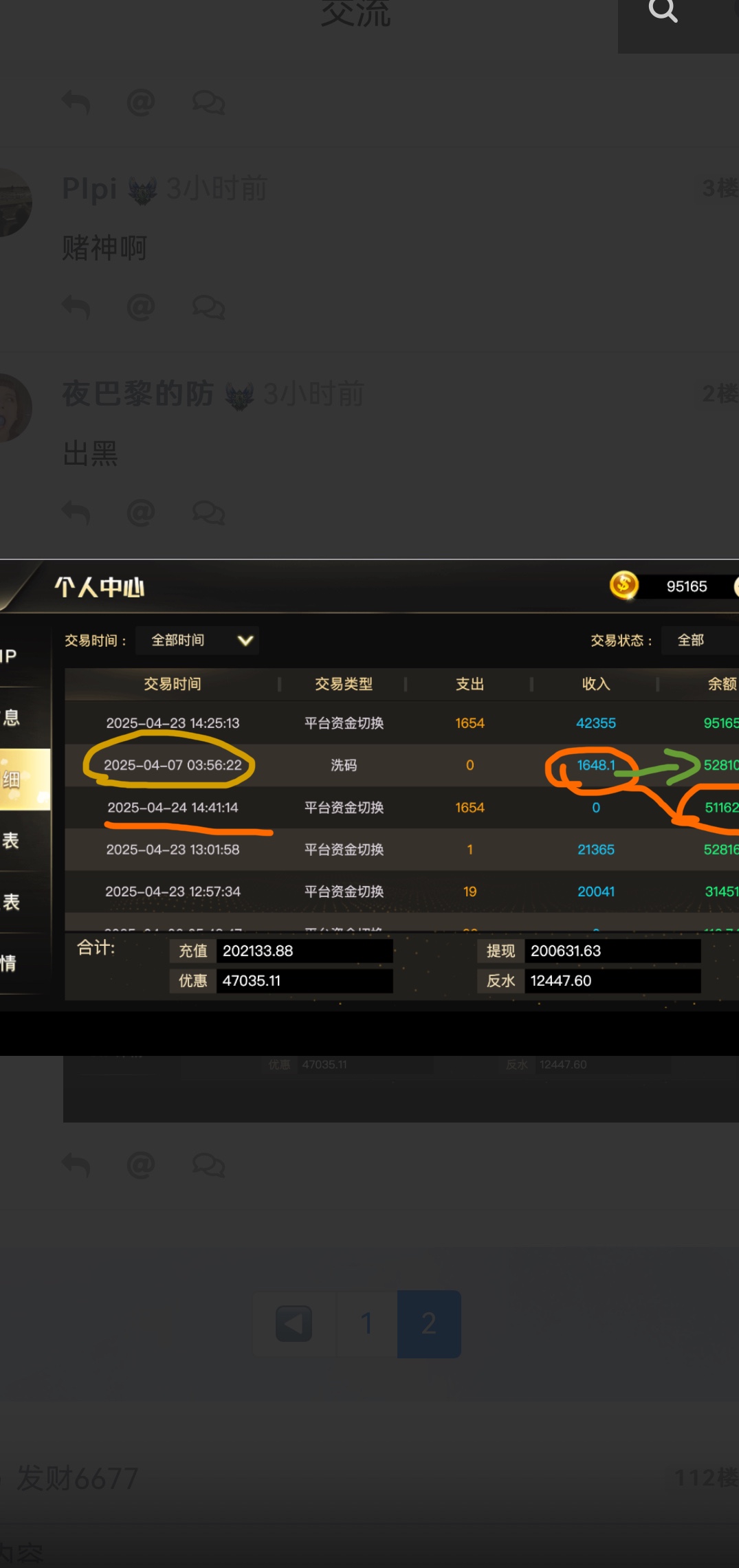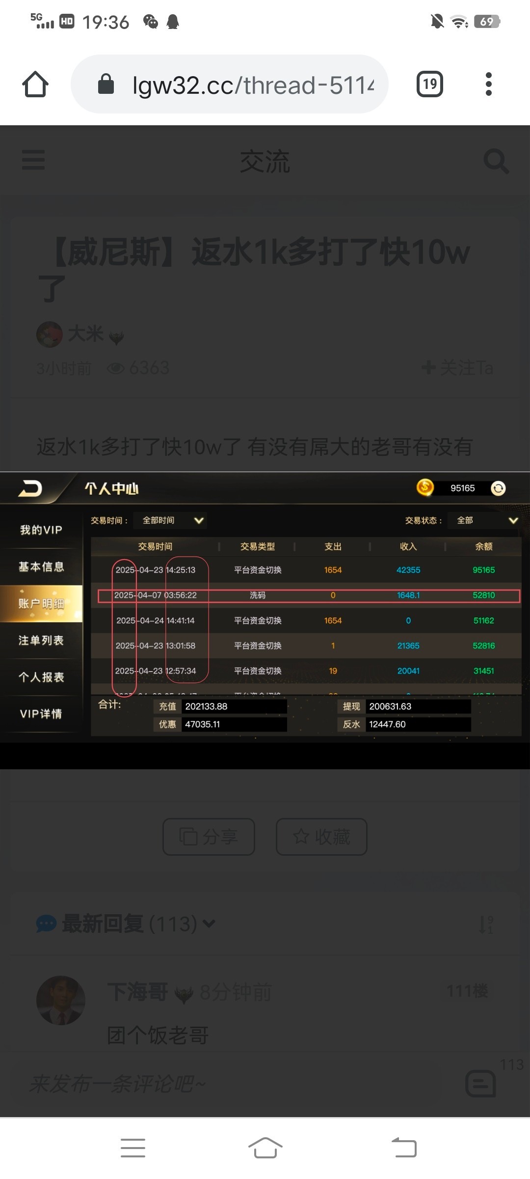 大哥 4.7号的是我打的返水没有领取 我就领取了4.7号的返水继续打 你在看一下其它都是23号的 这都不懂 还眼红了?你叫声哥 给你打个猪脚饭