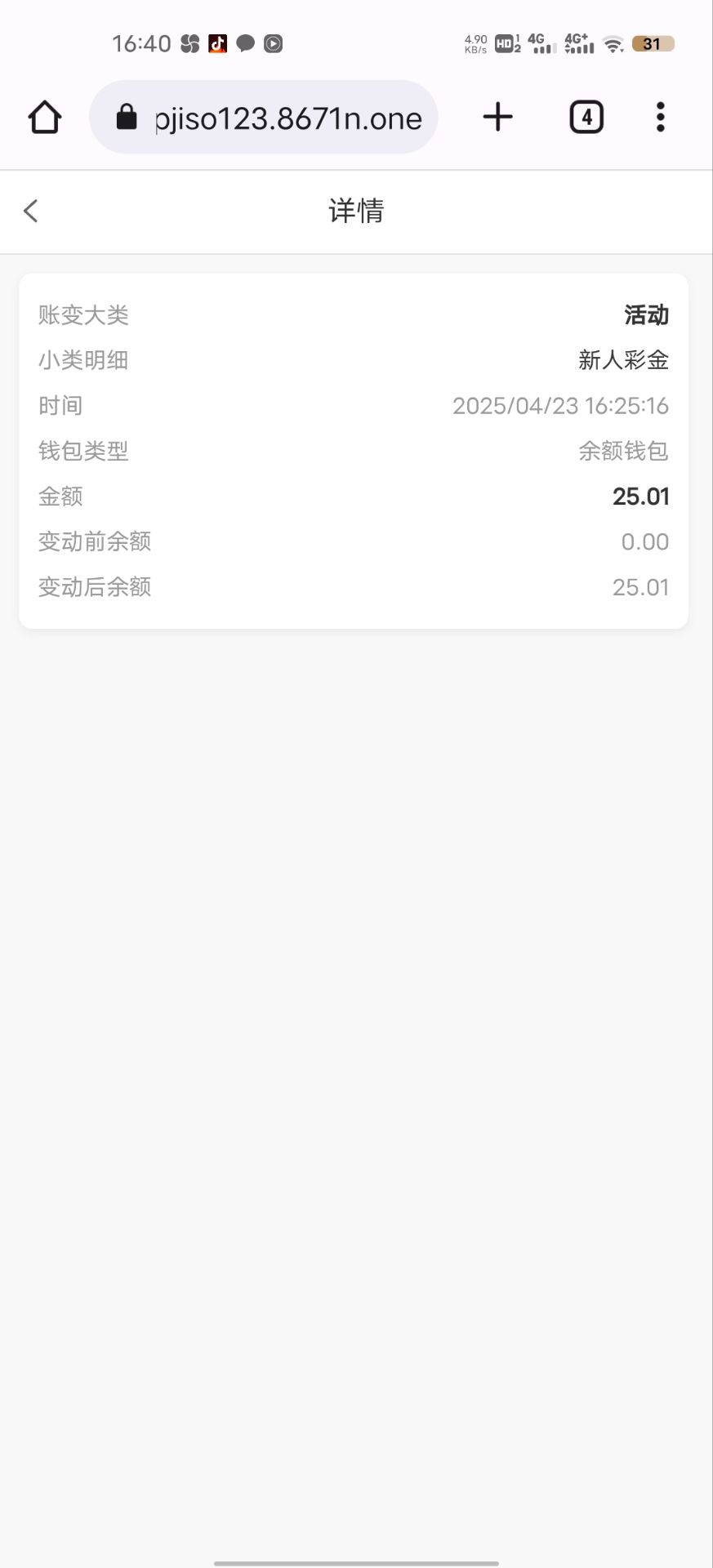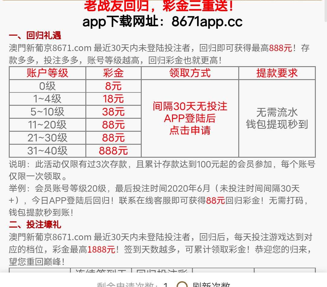 老白菜了,今天其中一个手机号收到了他们的短信特邀,注册领了25,里面还有回归活动,老哥们有没注册过得手机号可以碰瓷试试或者就等特邀也行,同理,有账户许久未登录的老哥也可以去申请回归彩金! 回归彩金需要历史存款过三次才可申请,没达标的老哥勿喷!当然友情提示:谨慎充值,认准稳台区!!! 地址 www.aknbv.one