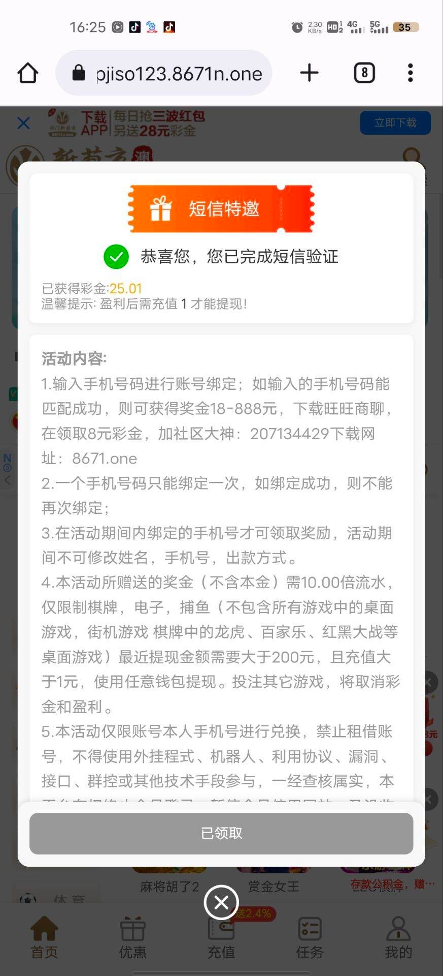 老白菜了,今天其中一个手机号收到了他们的短信特邀,注册领了25,里面还有回归活动,老哥们有没注册过得手机号可以碰瓷试试或者就等特邀也行,同理,有账户许久未登录的老哥也可以去申请回归彩金!