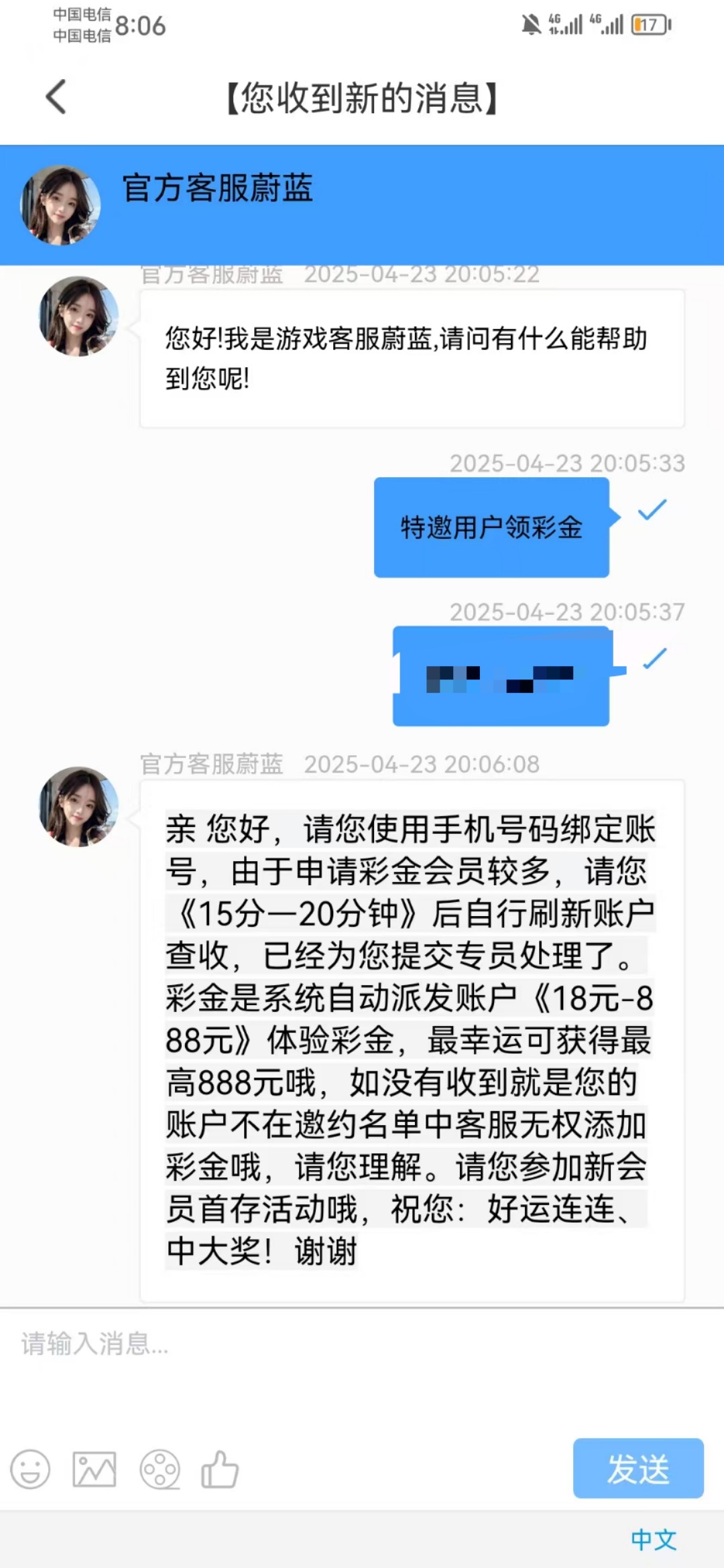 注册找客服发特邀用户领取彩金,然后发手机号,有就有没有就没有,别中出我