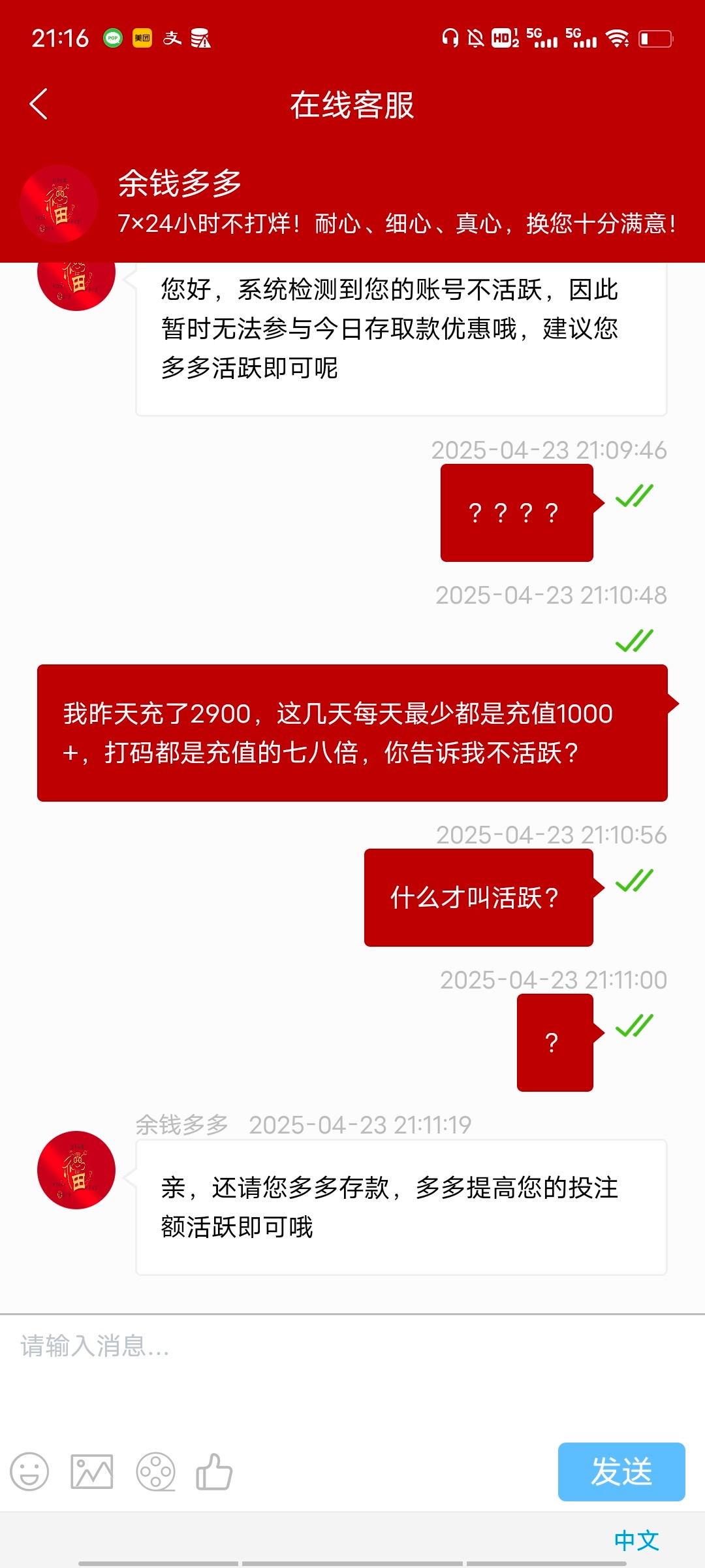 从过年到现在被他家吃了两万多了,990这个傻逼虽然从过年到现在也吃了我差不多快三万了,但是也没关我优惠啊,其他台子赢得全送给他家了,近一周每天我都是充值1000+,打码每天都是七八千一万多,昨天充值2900,今天把我优惠给关了,还说我不活跃,那怎样才算活跃?