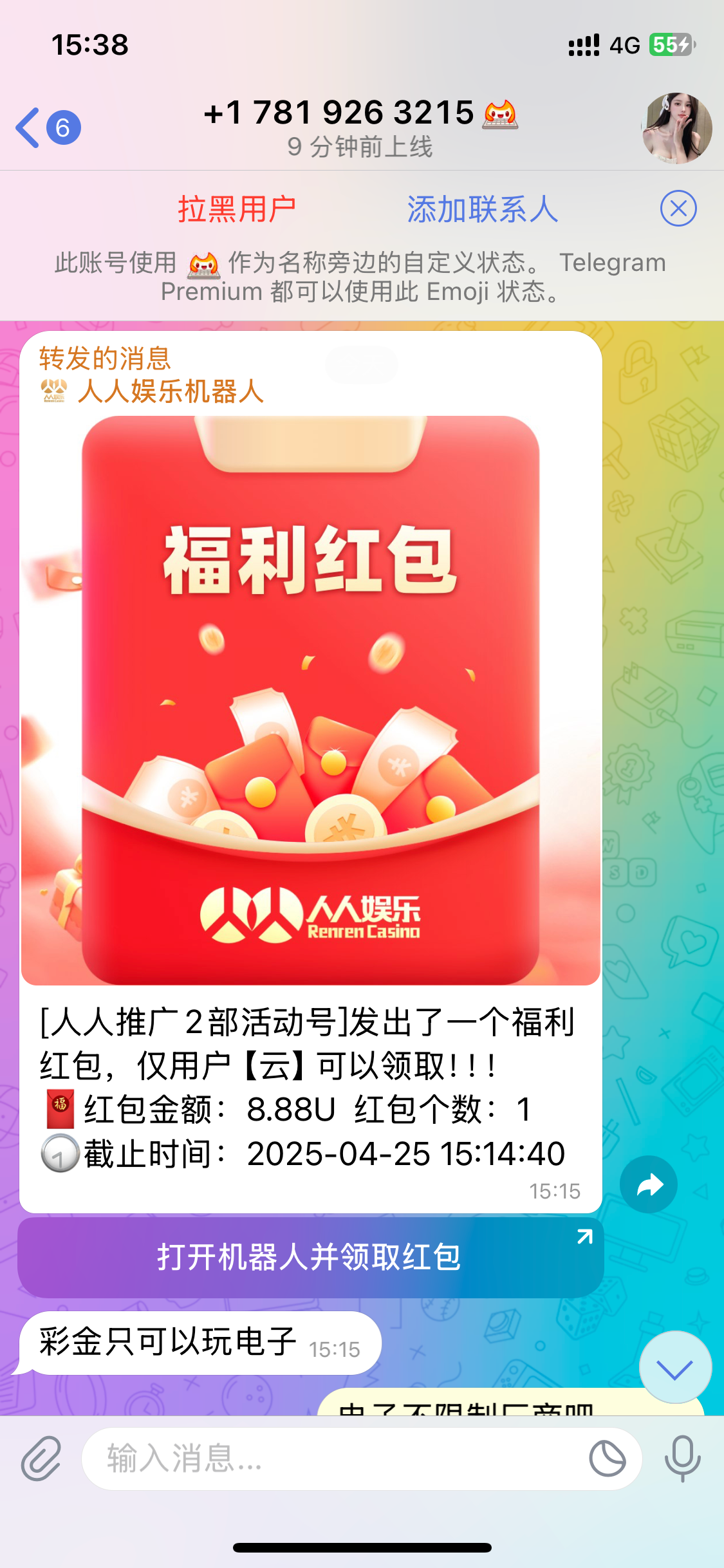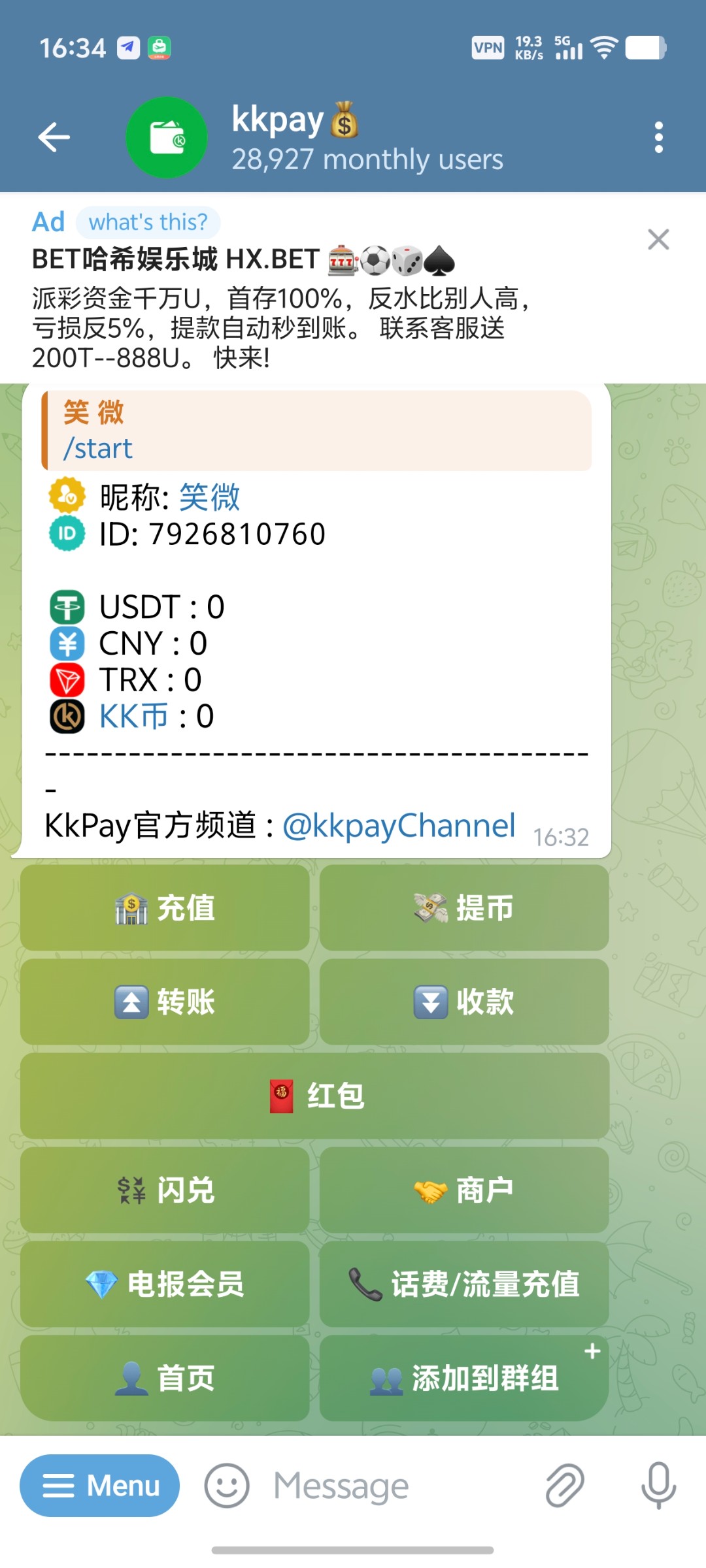 有飞机的可以点一下@kkpay 钱包置顶的人人娱乐广告点进去激活机器人,之后不用理会,会有专员私信问你要不要领取体验金,彩金限制电子5水,只能提彩金的5倍