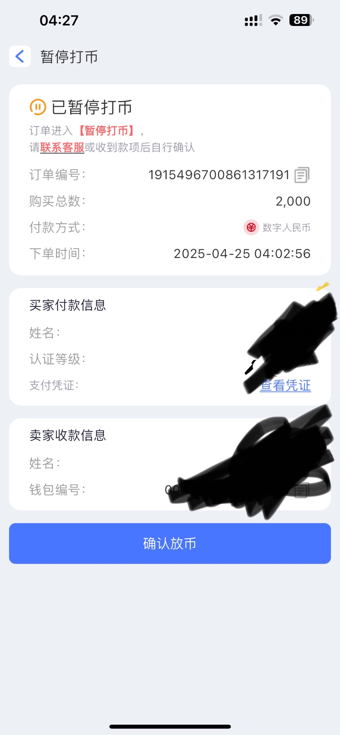 暂停打币跟客服说一声就行 昨天我也是卖270收到200 看实名也一样我暂停了 后面卖家应该是看出来了 又补了70