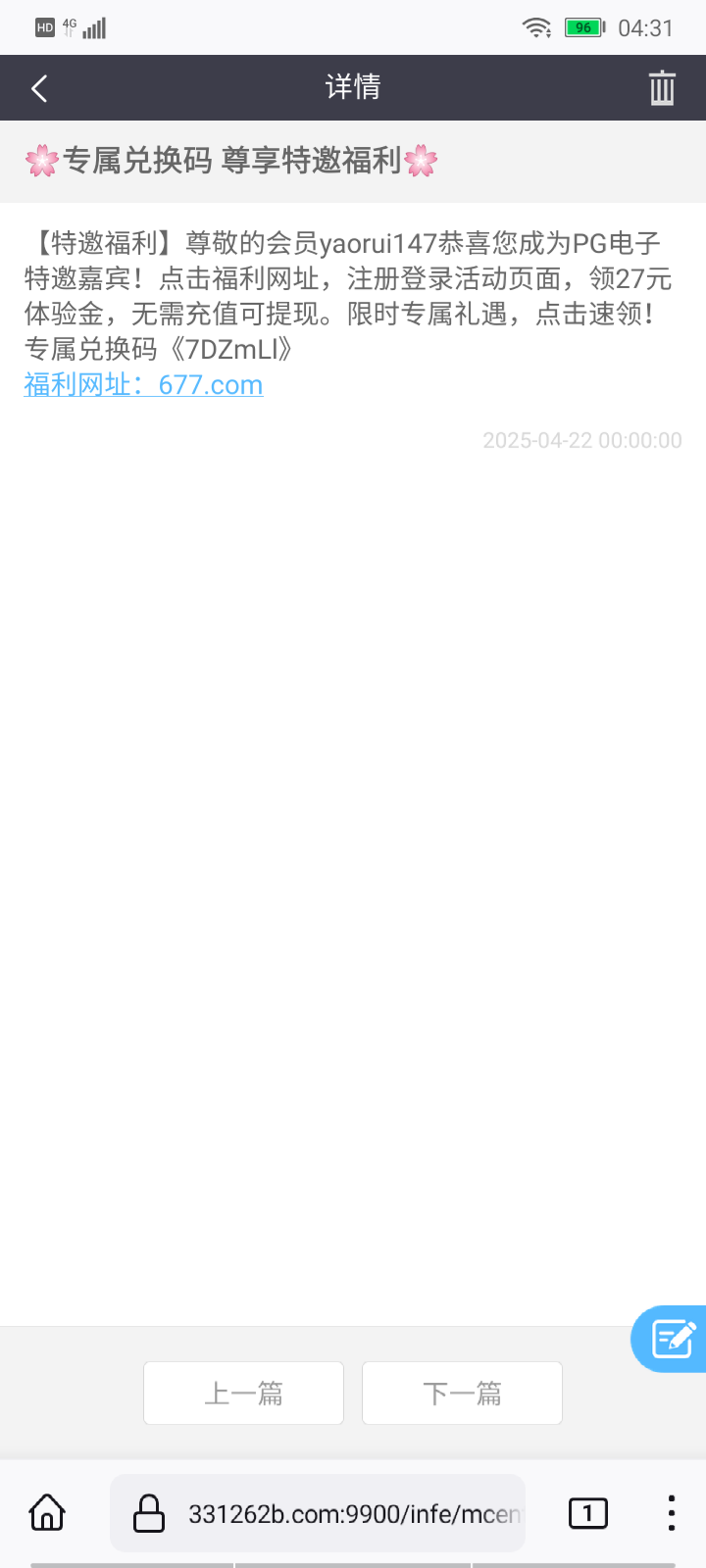 有玩过这个台子的老用户上号去看看站内信里面有没有图里面的这条,有就可以去领不要流水就可以提的,新用户和没充值过的指定没有就不用去了 694.com