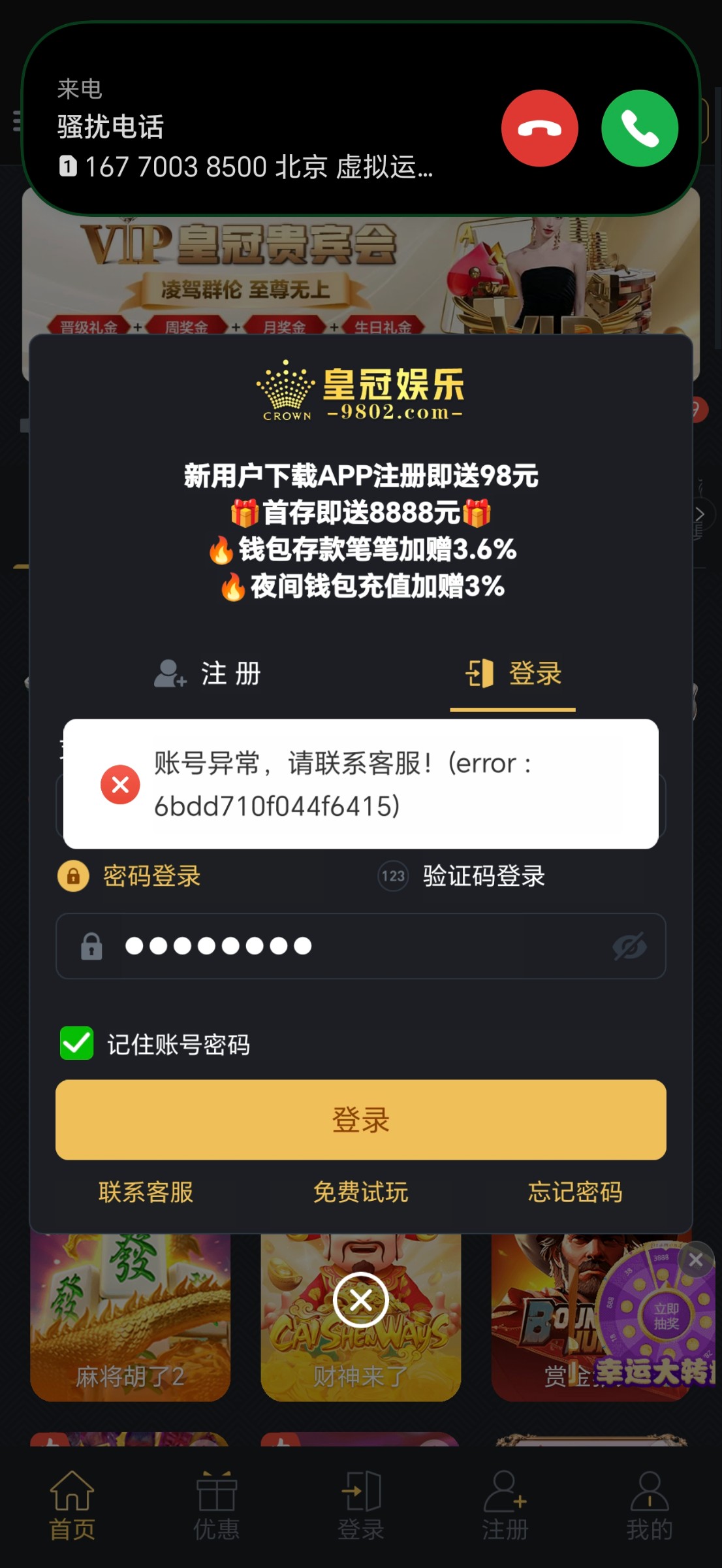 打电话送了0.88,打到200提款账号异常了。黑台。大家谨慎