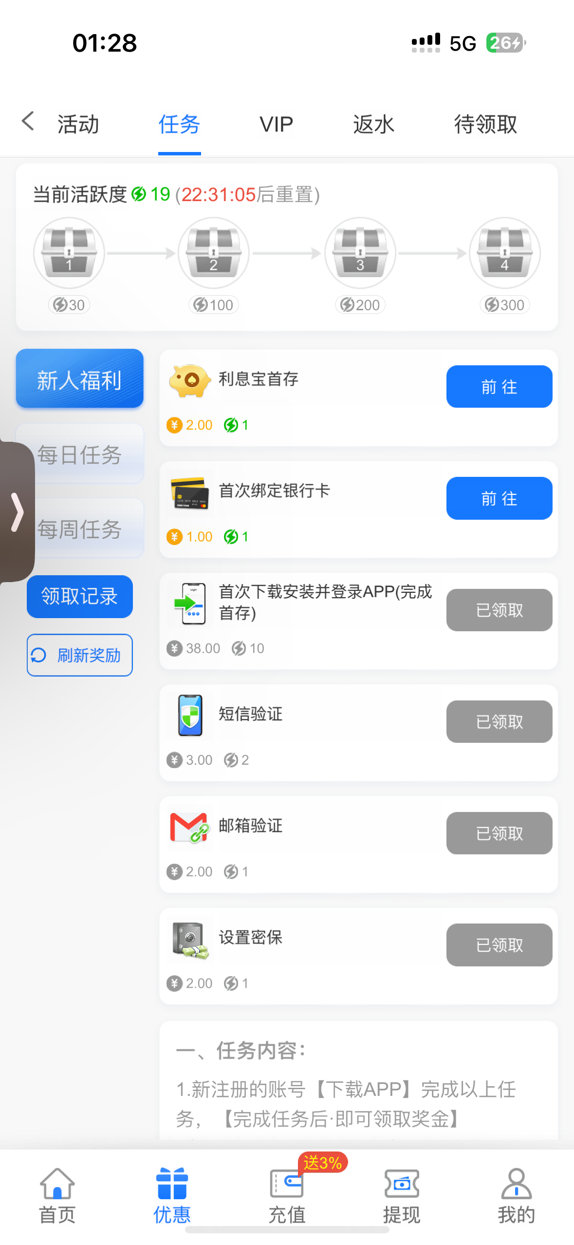 没有,要充值满100,累计两次才有新人任务