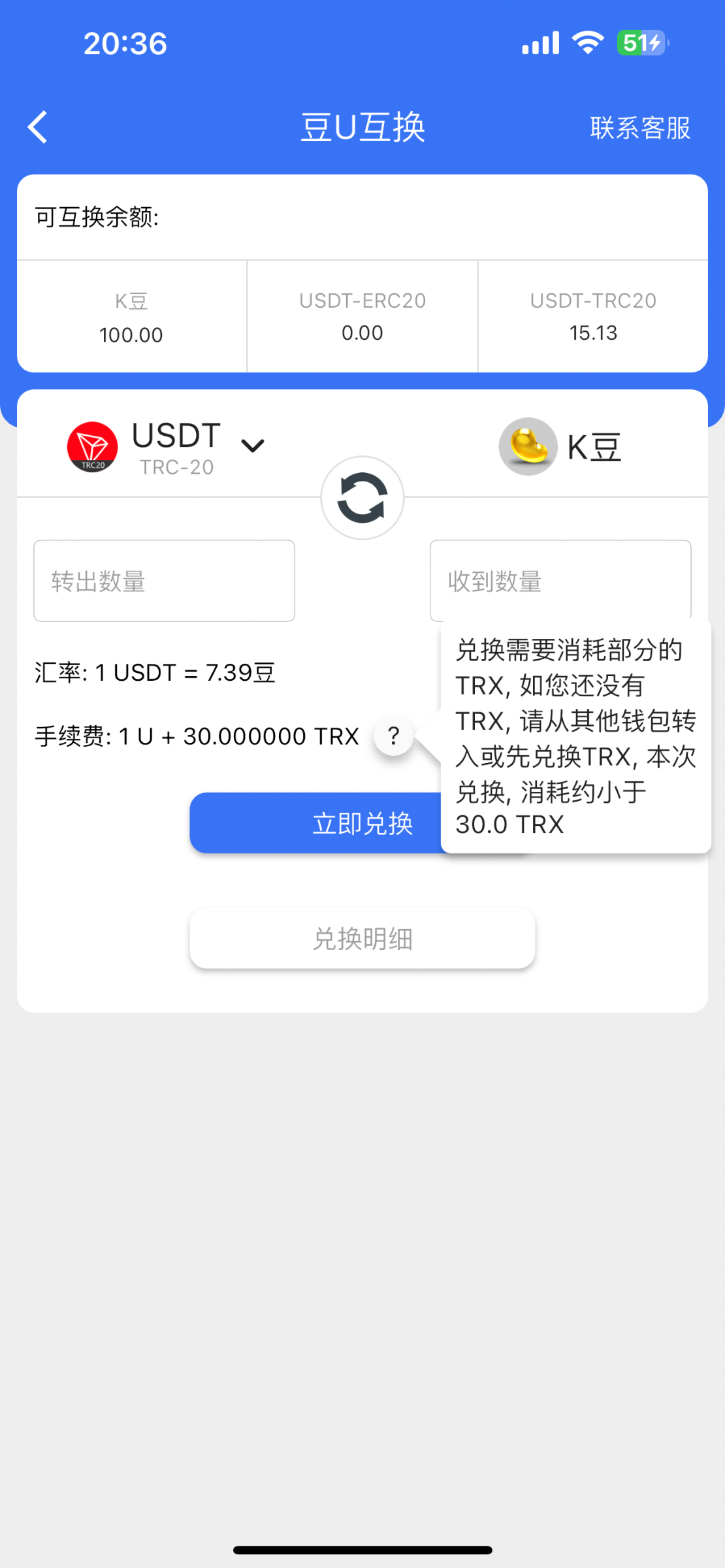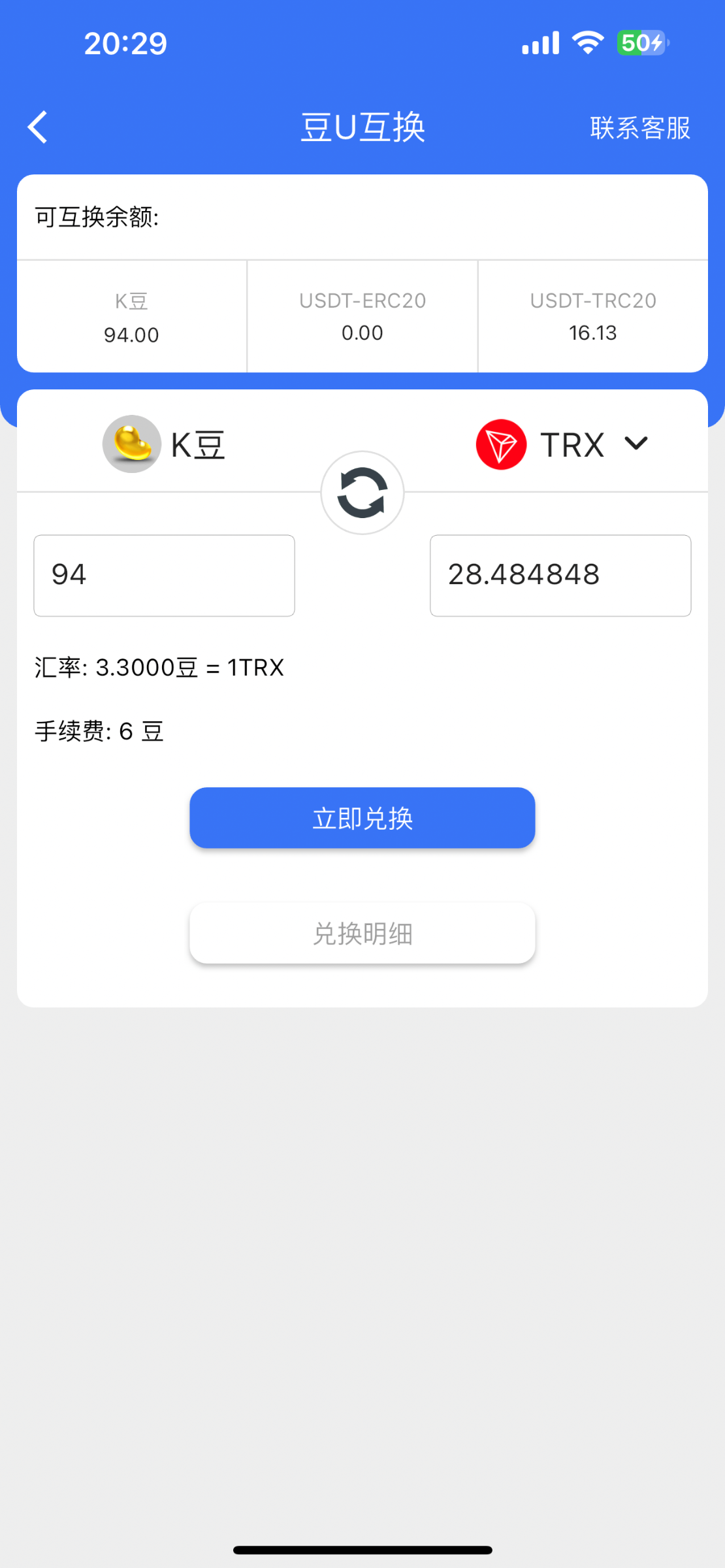 我是欧易买了30trx 然后充到k豆换的 这样可以只亏50