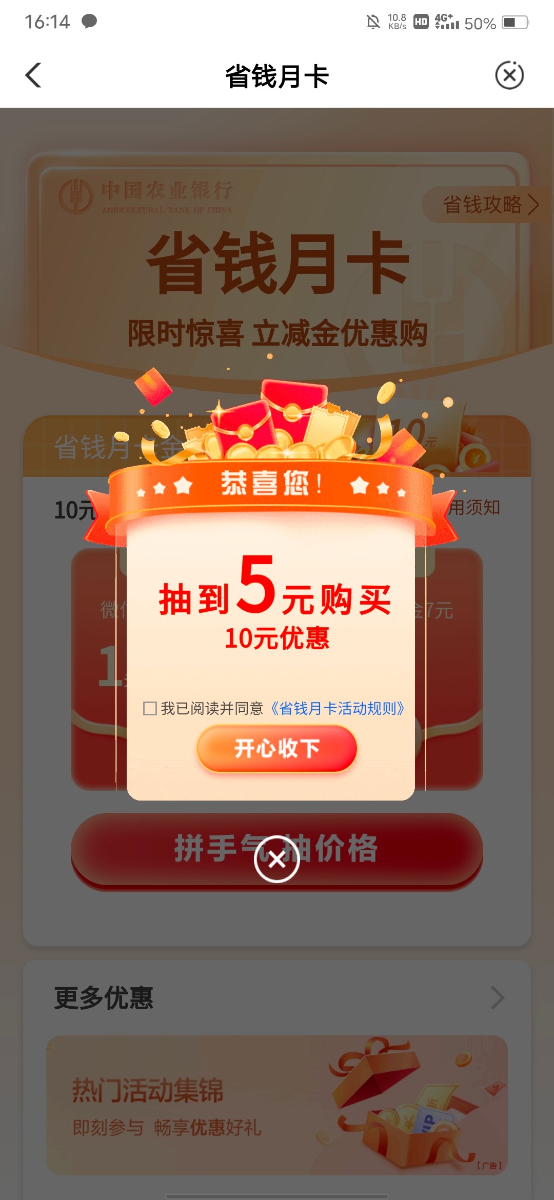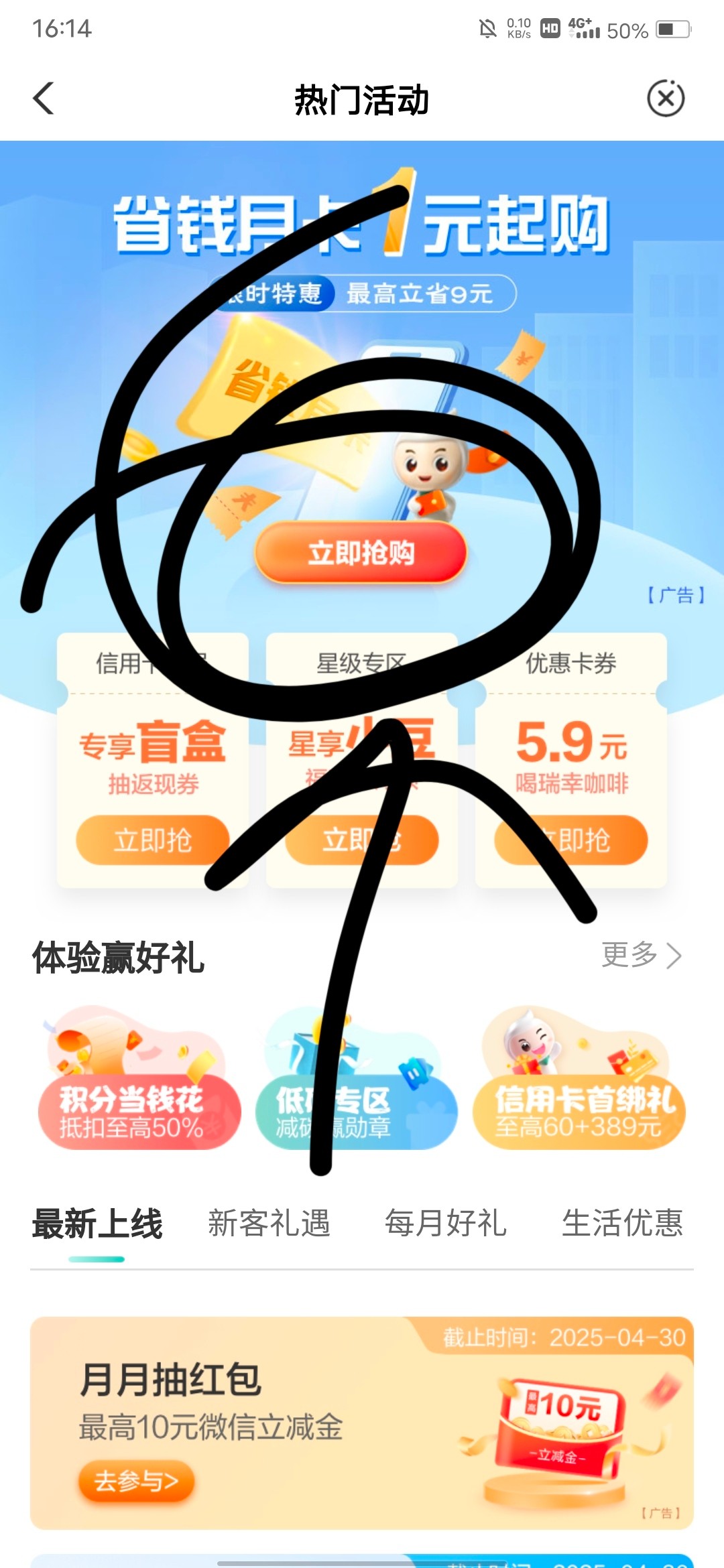 点最上面的省钱月卡 ,直接买,都是1~5块钱买10元立减金,通用的,