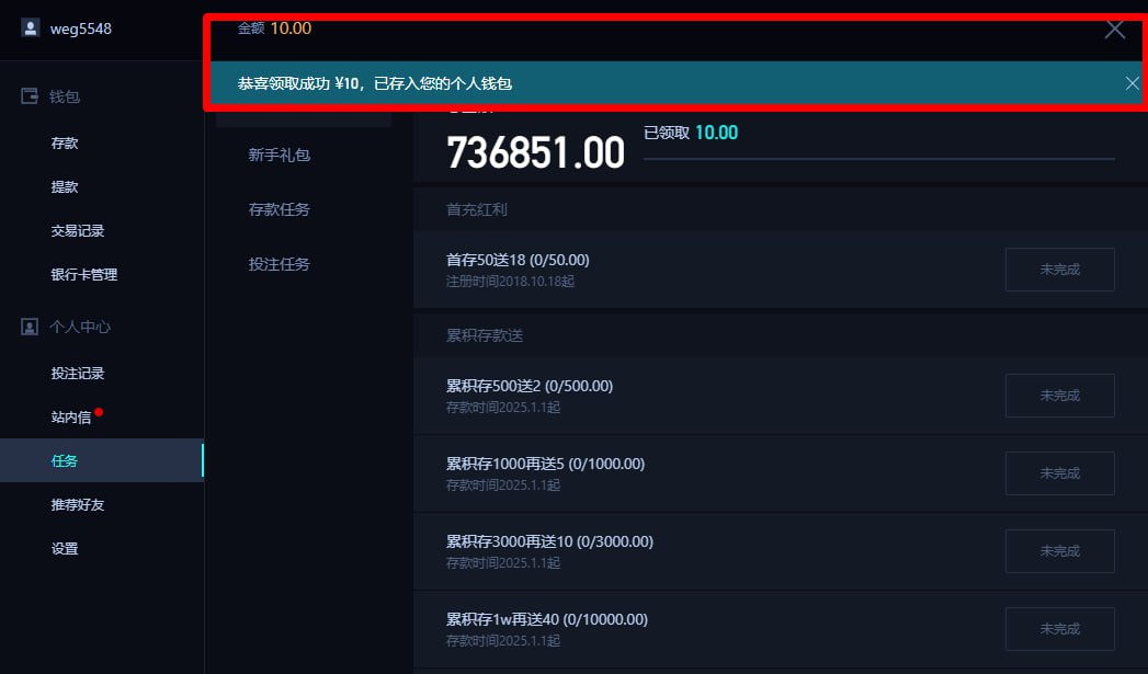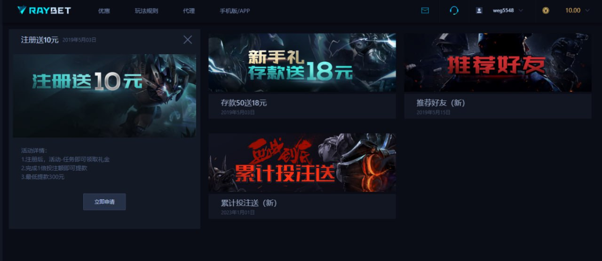 注册秒10,任务领取,仅限体育电竞游戏,最低提款300。