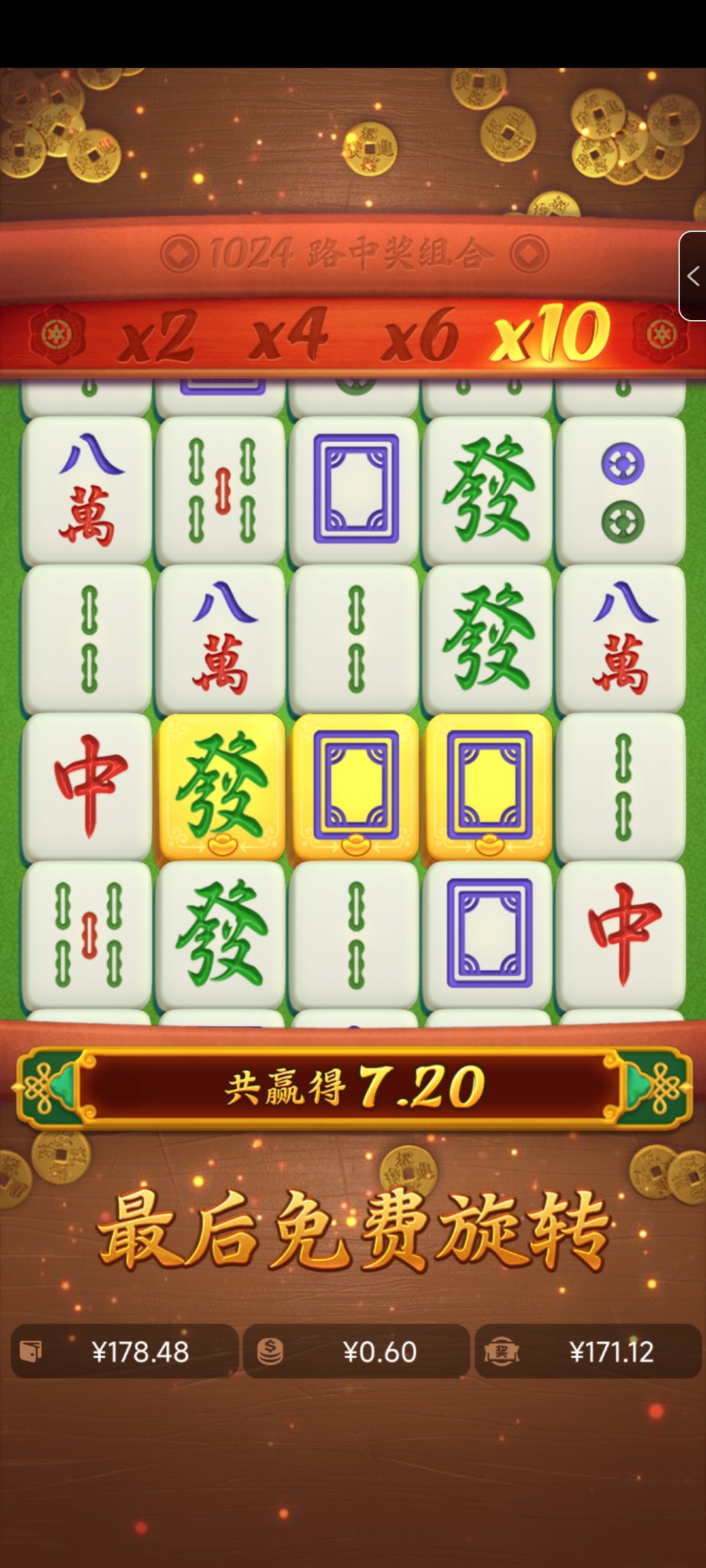 感谢线报。第一个号5没打出来。第二个号11假麻将0.4进三次免费爆1次70多米,外面平爆2次,一次20多米一次30多米。提了120米。