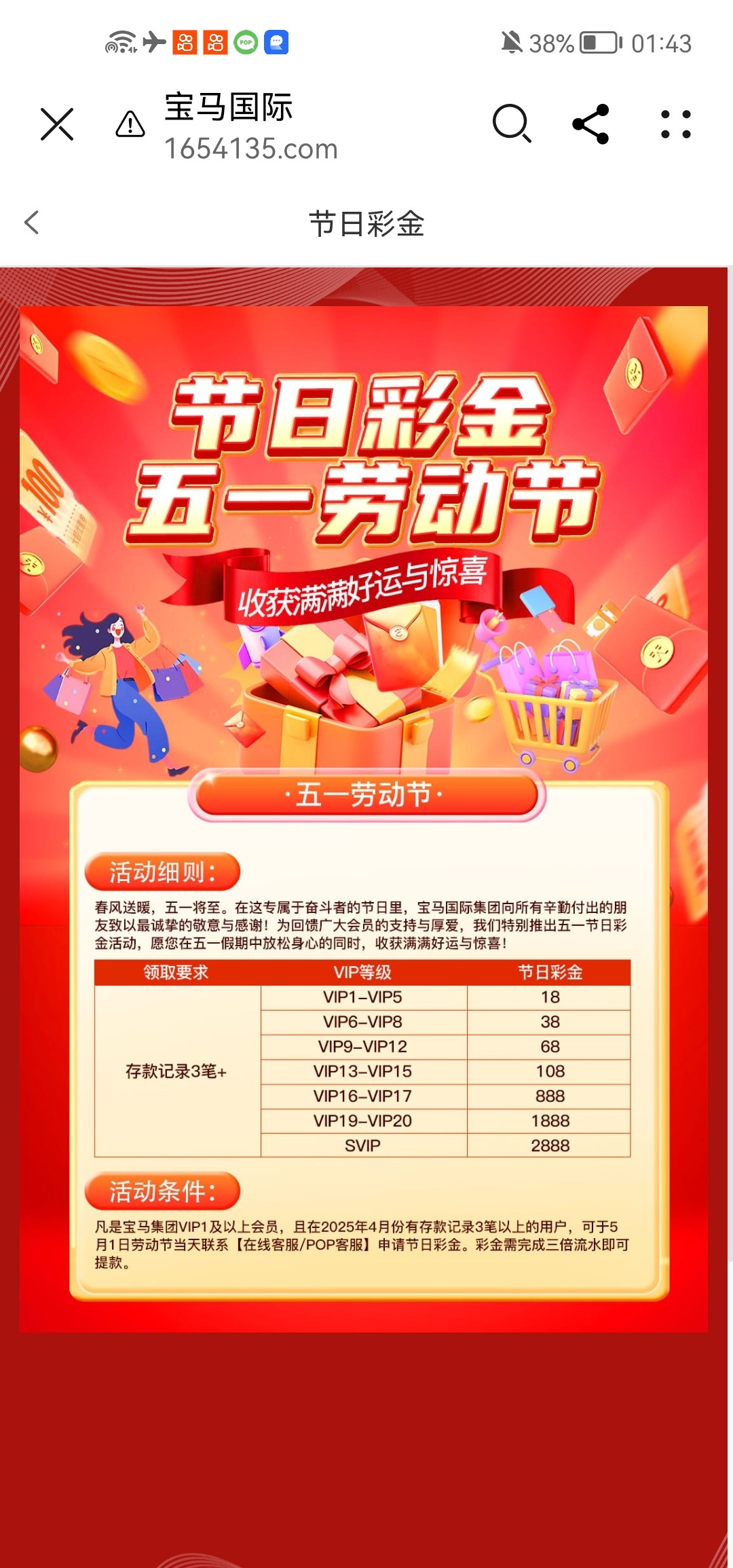 四月份有三笔充值记录的联系客服领取礼金,没有充值记录的无视即可网址 1654135.com