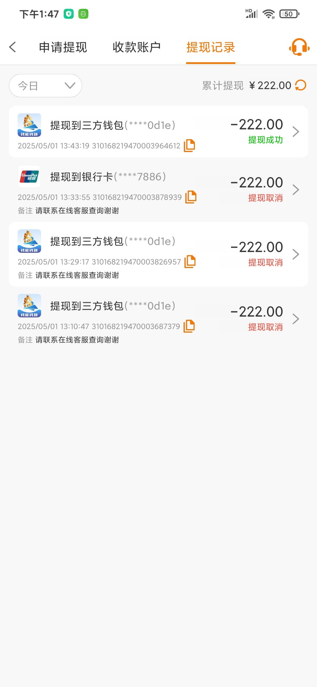 半个月前看到特邀的帖子去注册了账号,不在名单,刚刚看到帖子又去注册了个号领到了,提现222取消了,找客服说多账号,让保留一个号,然后就给提到账了