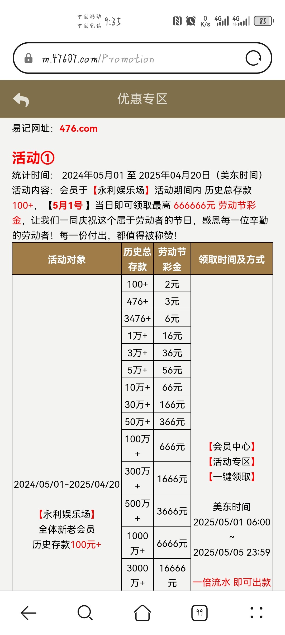 永利476.com有历史存款回馈,还有一个老用户回归存款优惠,存款1+就行。有号的上吧