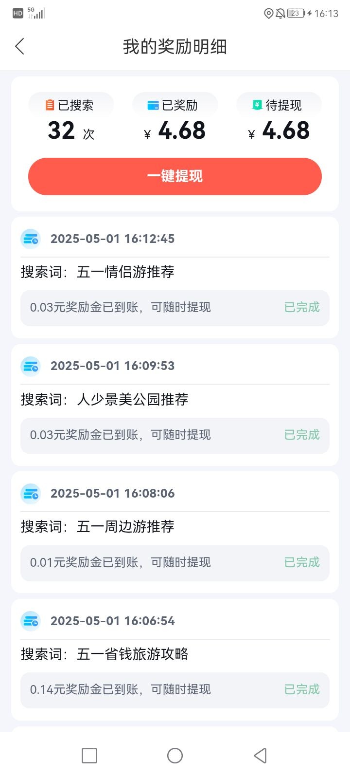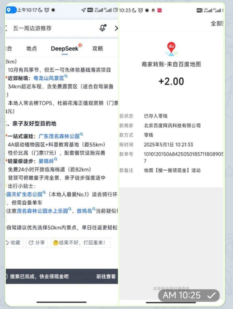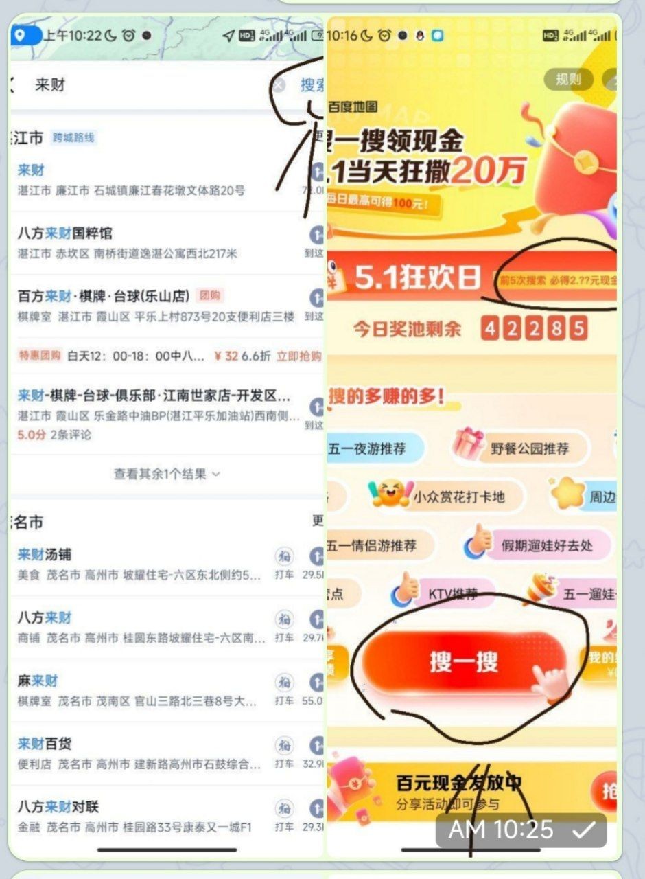 打开百度地图然后搜索来财,要点击搜索才会跳转活动,然后点击搜一搜,等那个机器人打完那些字下面会有提示搜索已完成就ok,搜索5次必得两块,多号多得