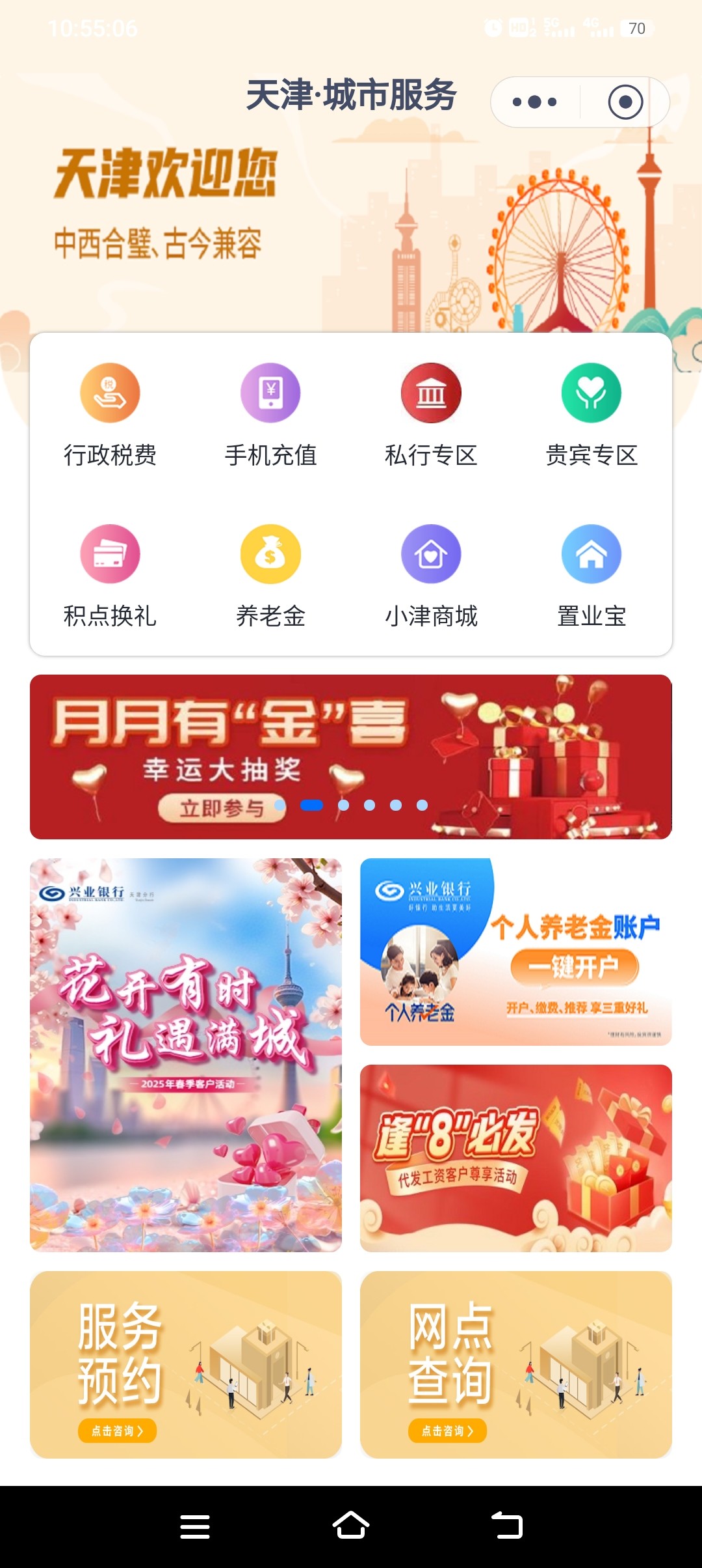 首页,下拉城市服务选择天津,横幅左右滑动点月月有惊喜。