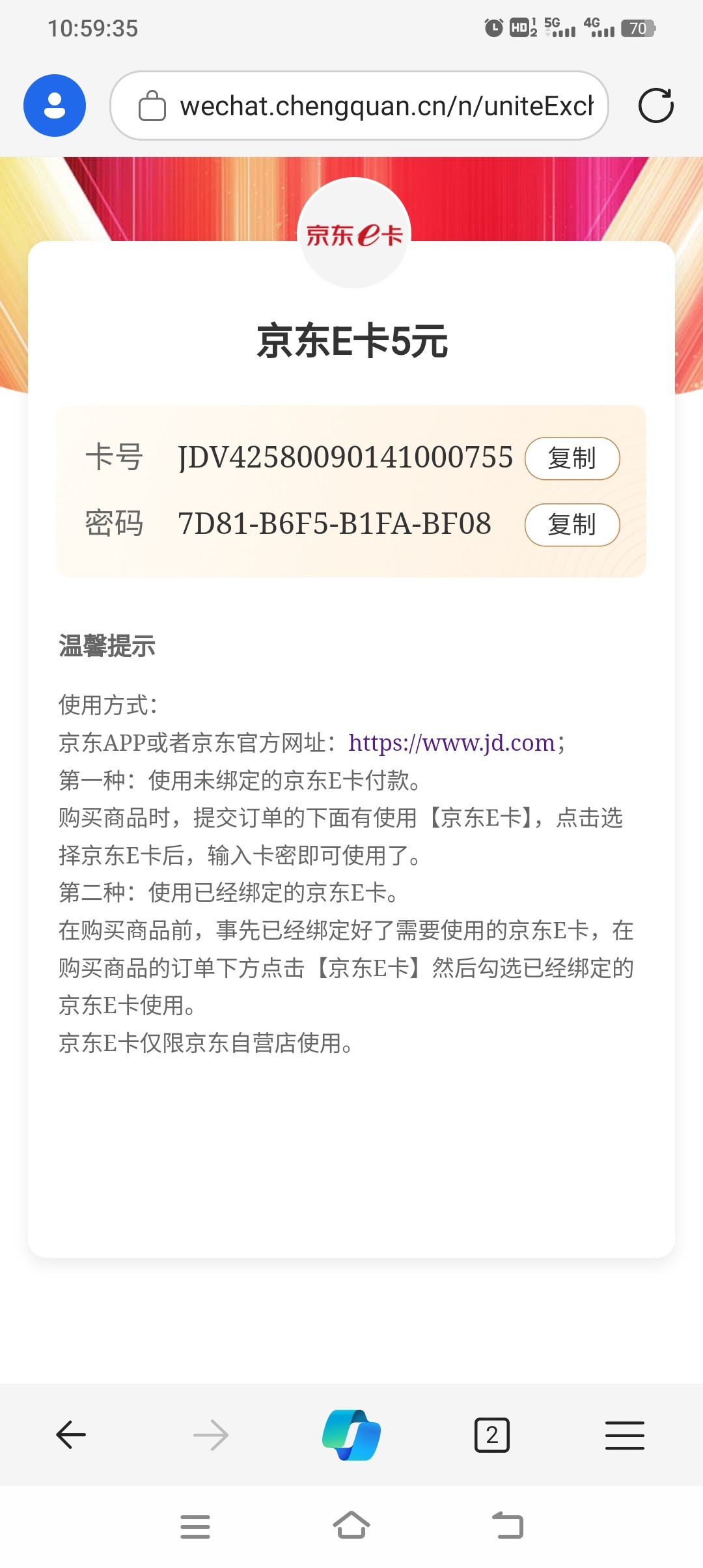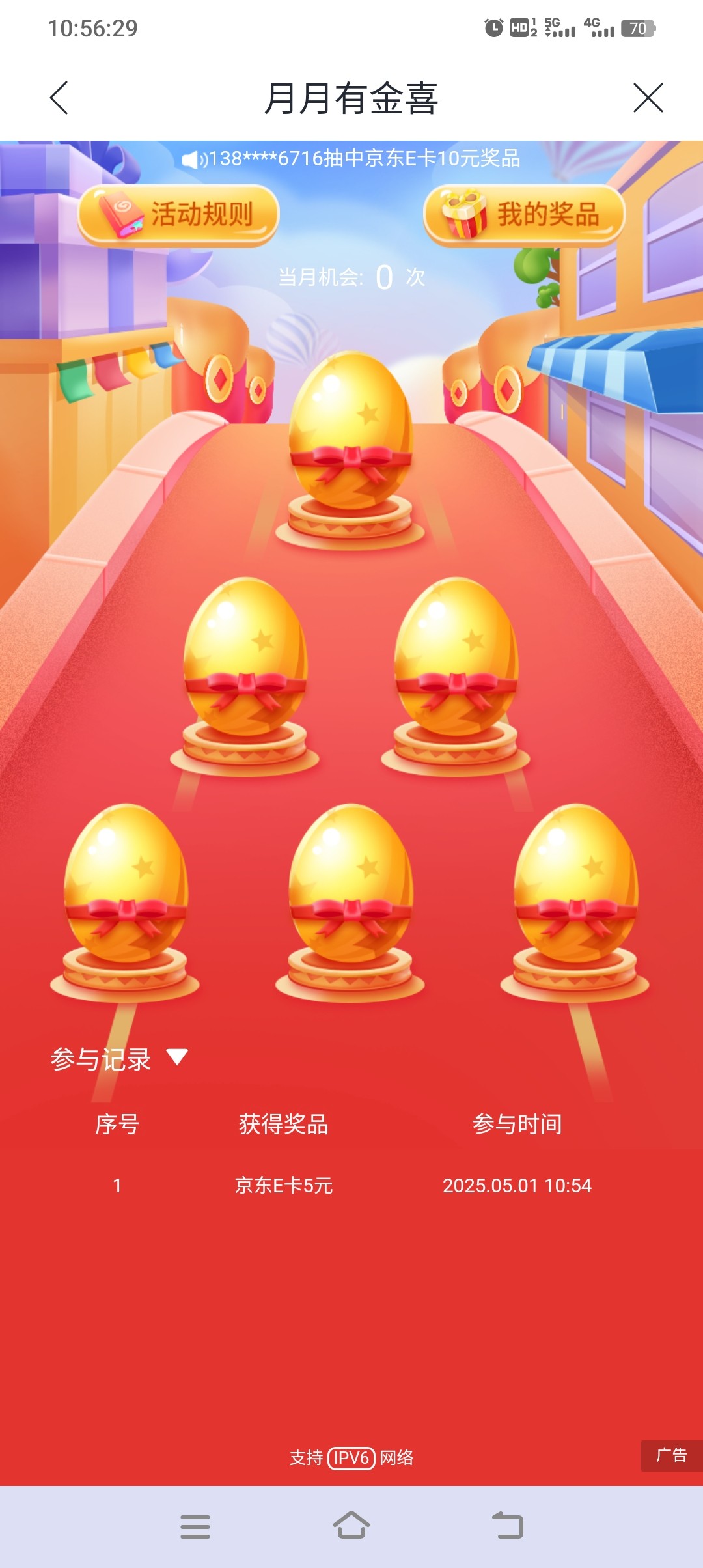 每个月只能中奖一次,不中第二天再去。e卡打开链接就显示卡号卡密了。