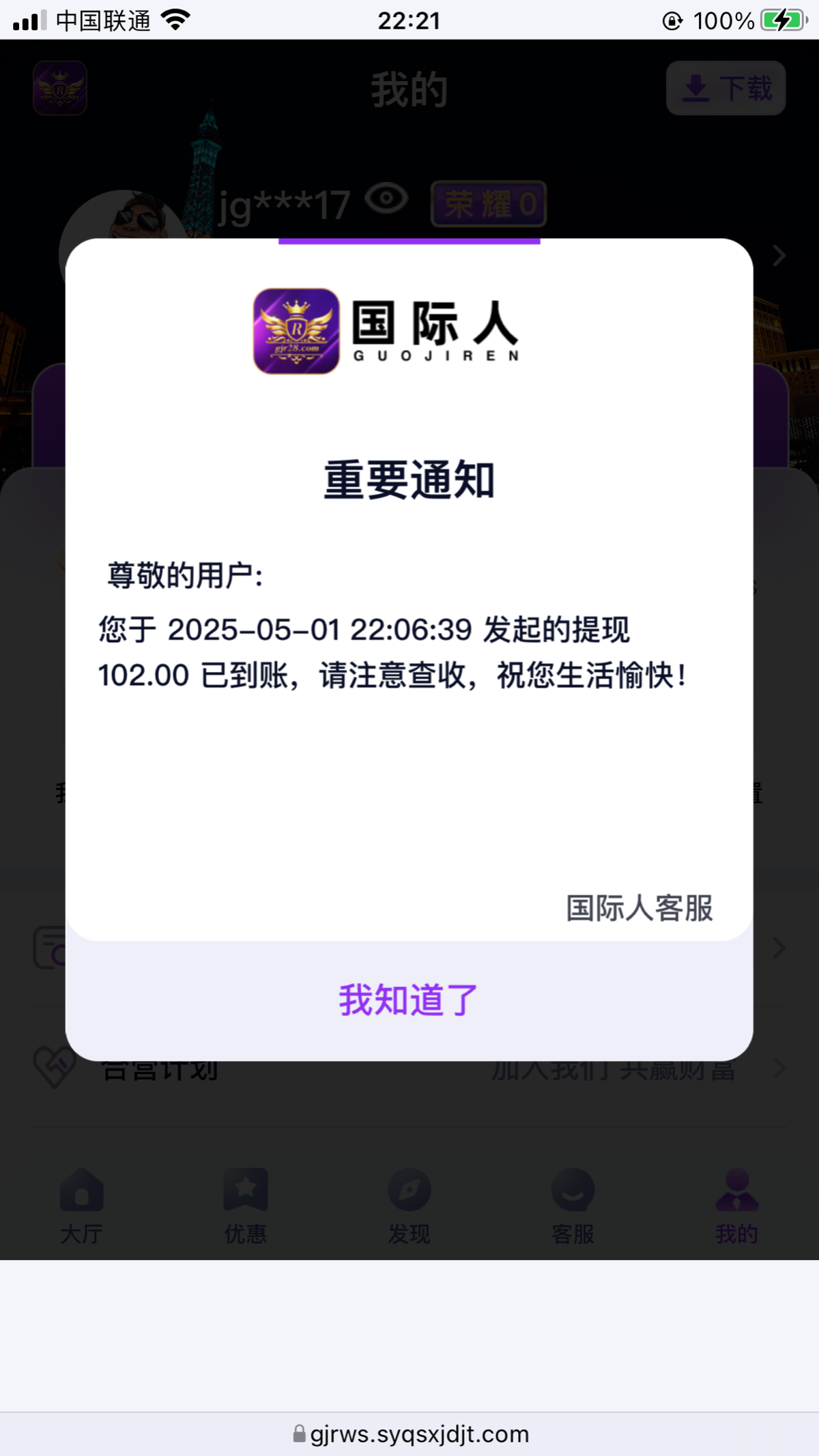 限制:无任何流水和游戏限制!,最低100提,最高无上限!,打出来的麻烦到国际人的帖子评论反馈一下,祝各位长虹!