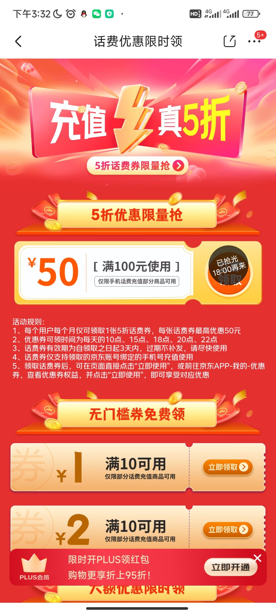 https://u.jd.com/grpf4ct浏览器打开链接跳转京东,上面的每个时间段都能抢100-50的卷,一个月能充值一次,应用商店下载个连点器抢试一下,觉得麻烦无视就好了